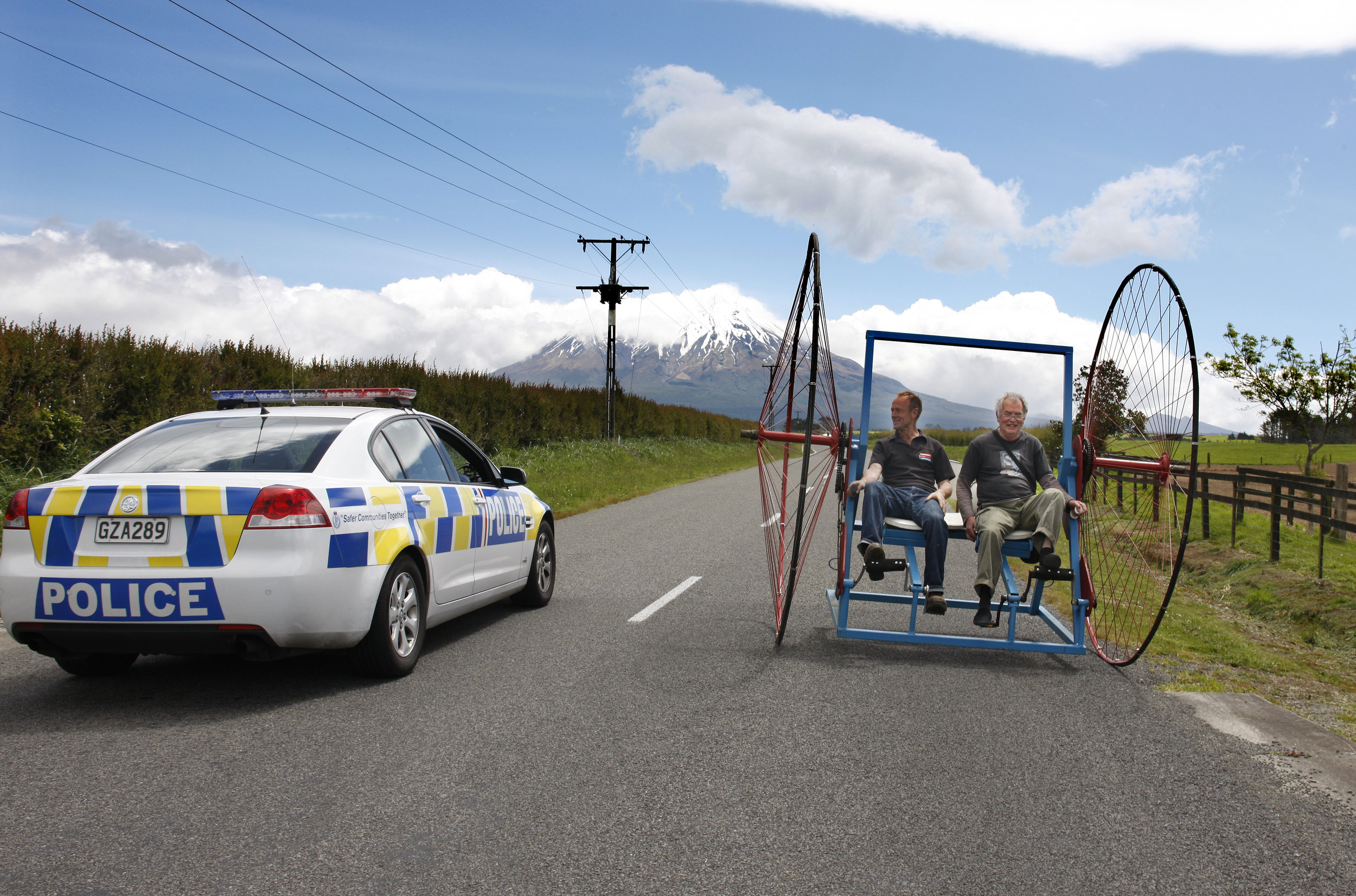Now parked alongside his Taranaki milking shed is his latest machine—his Spring project—a giant pedal-driven two wheeled device that really defies description. The machine took a month to put together.