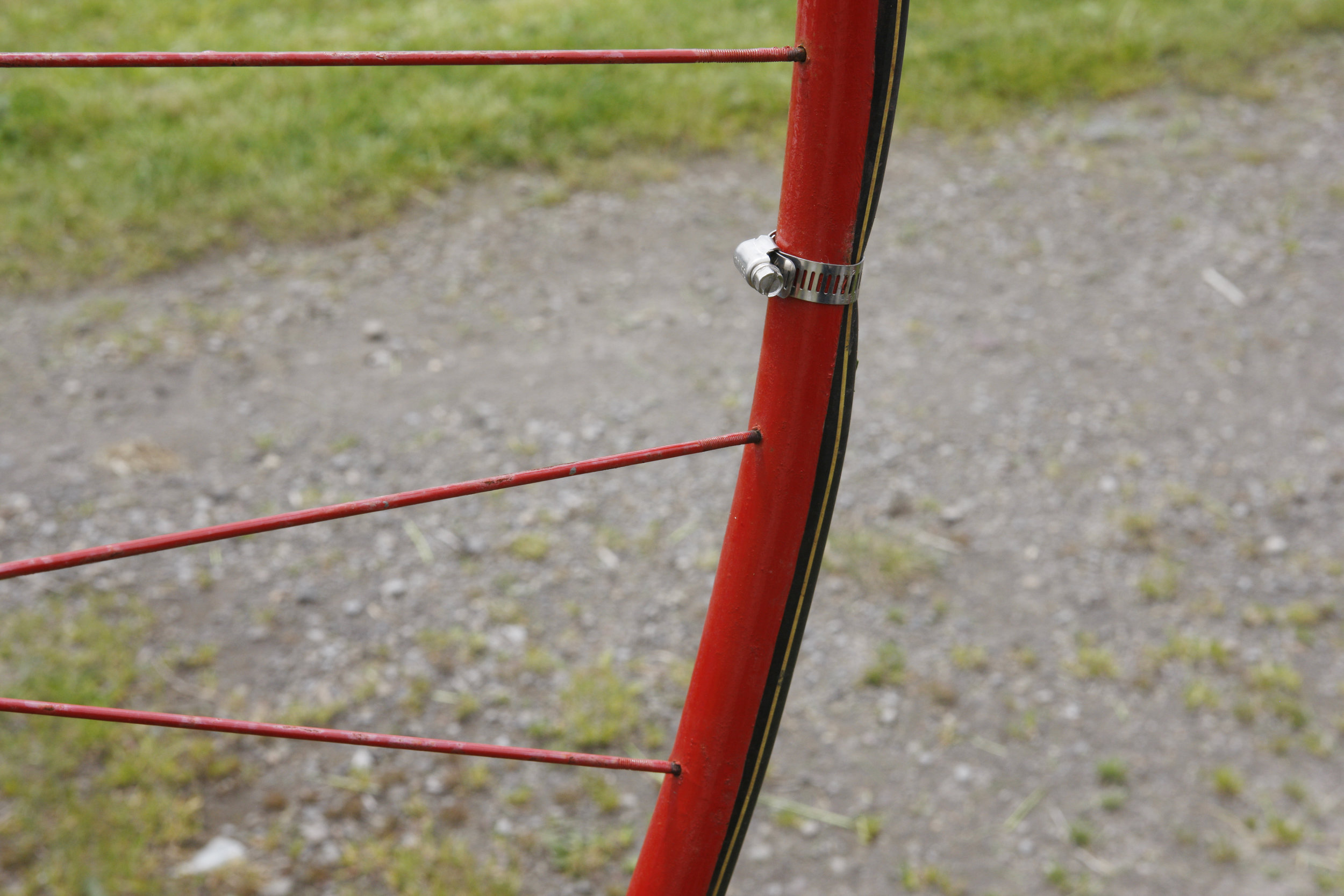 The tyres are made from 1 inch (25 mm) rubber milking tube, attached to the rim with hose clips.