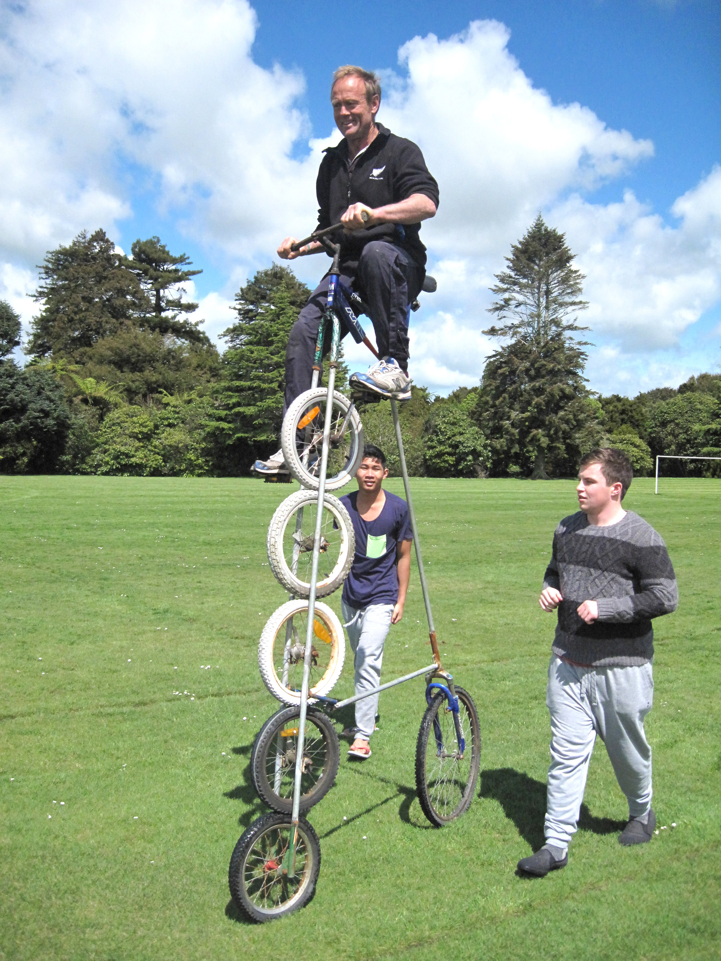 One of Dave’s home-made bikes is 2.6 metres high. After seeing a YouTube clip of a guy riding a tall bike with three front wheels, one above the other, Dave decided to go one better. “I thought I’d take it to the limit and five wheels should work,” he said.