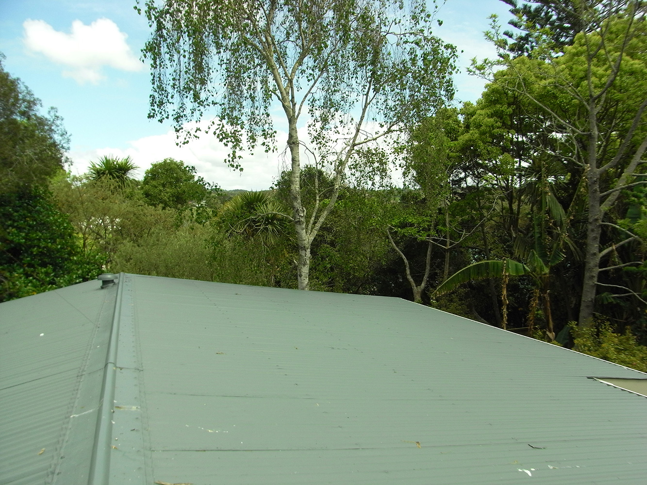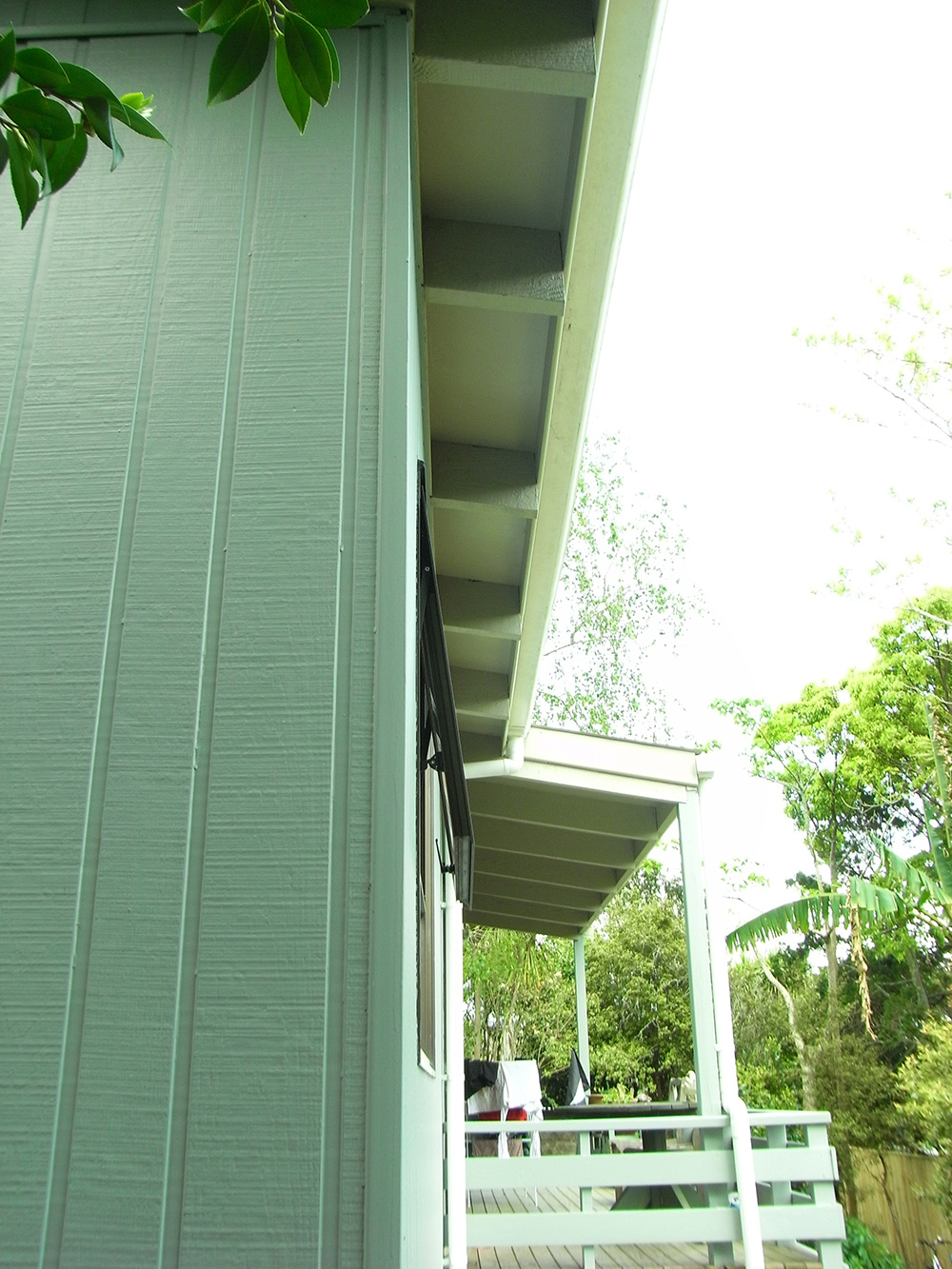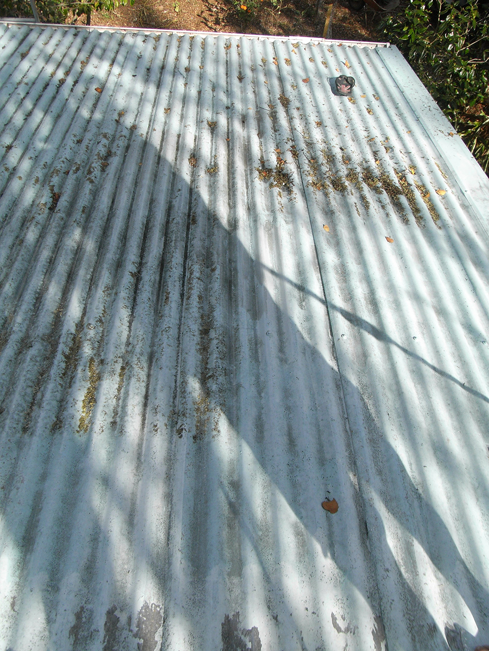 The cladding was OK. There was no damage showing and it needed only a repaint. The mould in the shady areas was superficial and I treated it as mentioned above. To discourage future mould growth I removed foliage that was causing excessive shading. The roof, painted corrugated steel, was sound. I took a sheet off to check the underside for rust. A waterblast and repaint was all it needed.