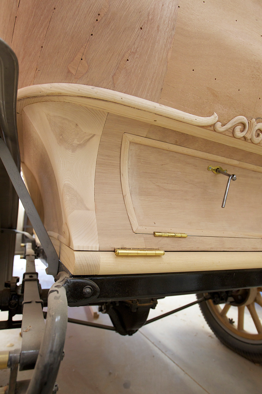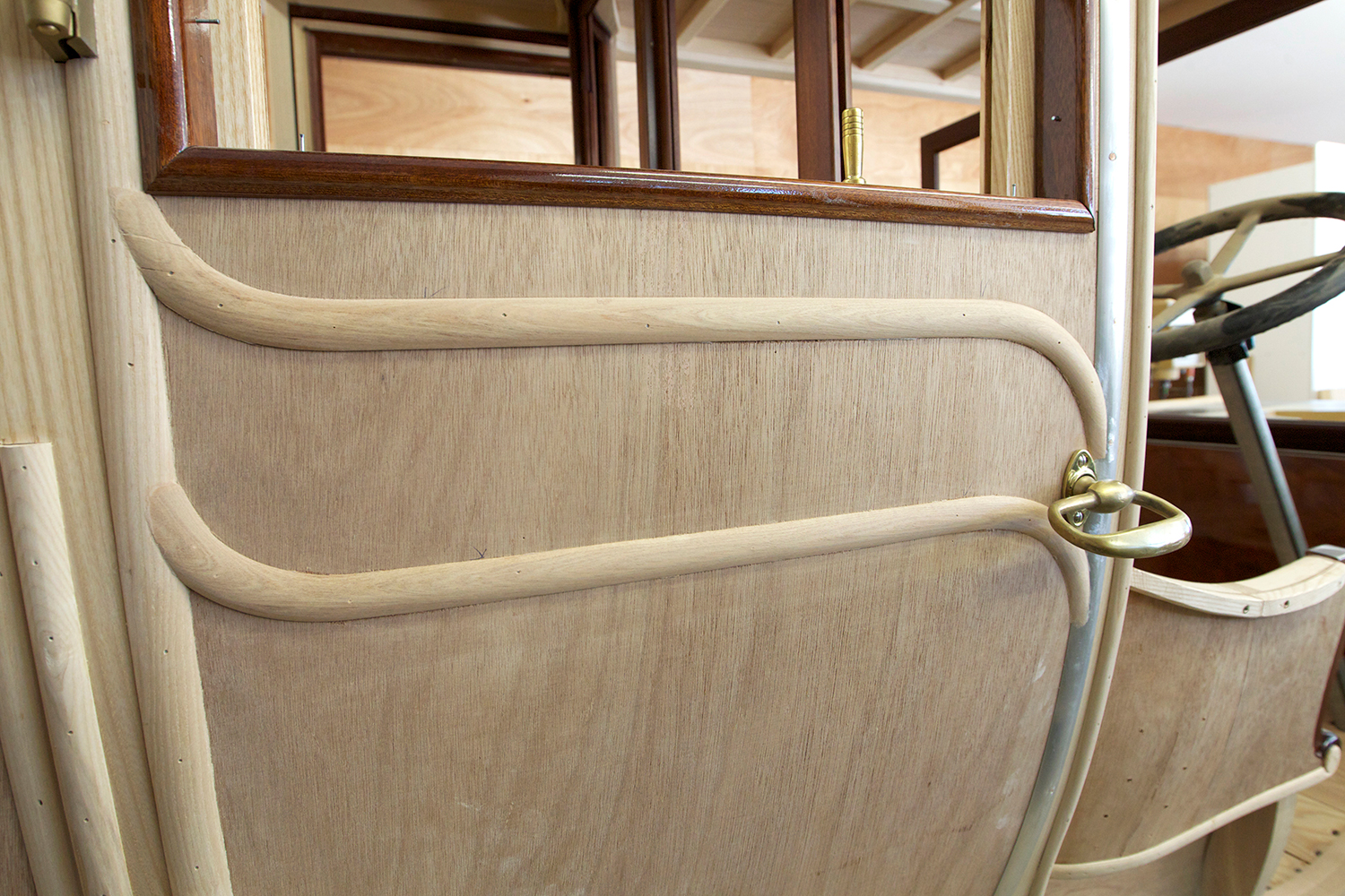 The challenge of this job has been to build the complete wooden body of a 107-year-old horseless carriage from scratch, using only a drawing as a guide. The project started with a bare chassis with a wheel in each corner and an old picture that Neil was given to work from. In the days before metal-bodied cars, the framing and skin of the car was all wood and Neil is building up the entire body. He believes the wooden body is the same weight as a metal body and says in the old days people often bought a car with a chassis and running gear and then took it to a coachbuilder to have a body made to order. “Each coachbuilder had their own style. Many car bodies were thus custom made.” The first step in restoring the Arrol Johnston was to make a small wooden mock-up of the body of the car using bits of wood and dowel. From this model, Neil mapped out the shape by attaching sheets of chipboard to the side of the vehicle and drawing up the life-size dimensions. “The only photo we were given was of a double landaulet Arrol Johnston. This one is a single landaulet, so we had to modify.” A landaulet is usually a car with a convertible roof for the passengers and a fixed roof for the driver. “The chassis has a shorter wheelbase than the car in the photo, which meant a few challenges,” Neil said. “As well as estimating the length and shape of the body, I had to extend the curved wall behind the driver to allow for more room. The chauffeur’s seating was very small and the new owner wants to drive it himself so I’ve had to enlarge that area. “This is really an Edwardian car. It has style and lines from the early 20th century and that makes restoration interesting.” He has designed Edwardian scrollwork and patterns to match that era. “Early coachbuilders were used to making fancy work on gigs and carriages and this carried on with motor vehicles,” said Neil.