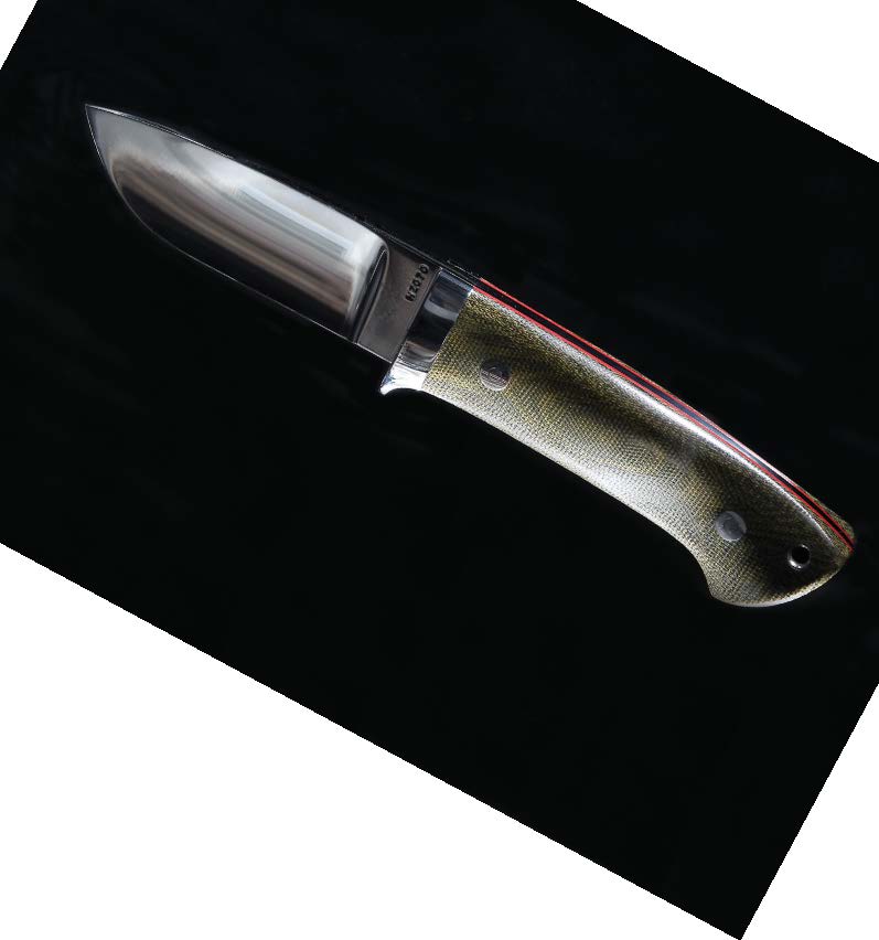 Think whether your knife will be for camping, hunting, for on the farm or just day-to-day use. You don’t need a knife with a ten-inch (250 mm) blade to cut the string on hay bales while feeding out. The design for this article is my everyday carry knife, a four-inch (100 mm) dropped hunter—an allround knife whose blade is ample, large enough to skin that buck and small enough to carry all day without getting in the way I choose 01 carbon steel for my design. It’s a good-wearing steel, easy to sharpen and available at your local steel depot. It is also easy to heat-treat at home with no special tools or equipment—just a heat source, a magnet and your kitchen oven (when the good woman is away). The first step is to coat the blank steel in engineers’ dye; this will enable you to mark the blade out with clear legible lines. I clamp the pattern to it, mark around the prole of the pattern with a scriber and drill the holes that the handle will bolt to. In my design these are 4 mm for the handle fasteners and a 6.5 mm hole in the end for a thong tube. After the scribing and drilling is done, I remove the clamped pattern.