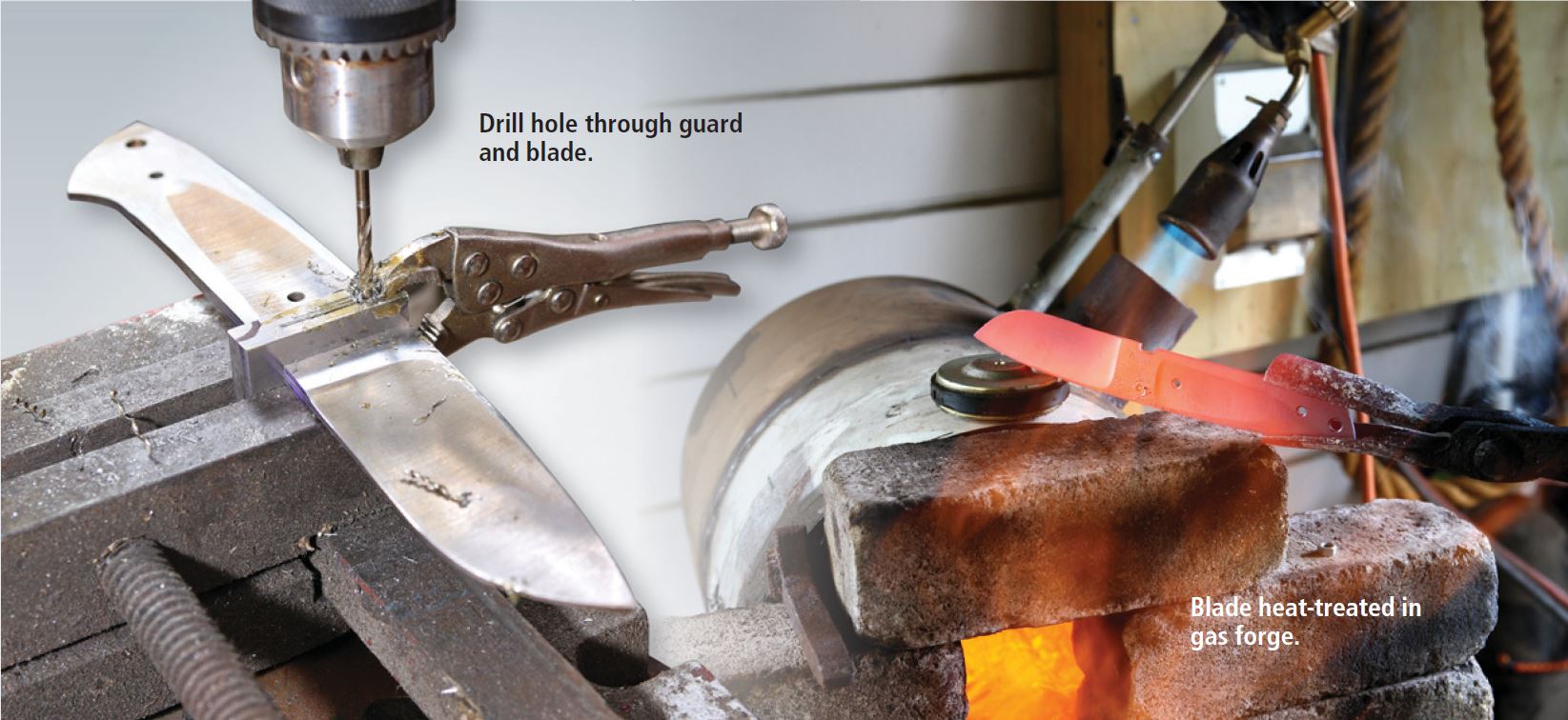 To heat treat, I use a forge made from two old 9 kg gas bottles welded together end-for-end and lined with furnace wool. My heat source is a Sievert gas burner with a hole for the flame to go through. You could use a gas torch. Once the forge is up to temperature, clamp the blade in a secure pair of tongs, or in long-handled pliers or the like. Put the blade in and out of the flame while rotating it to