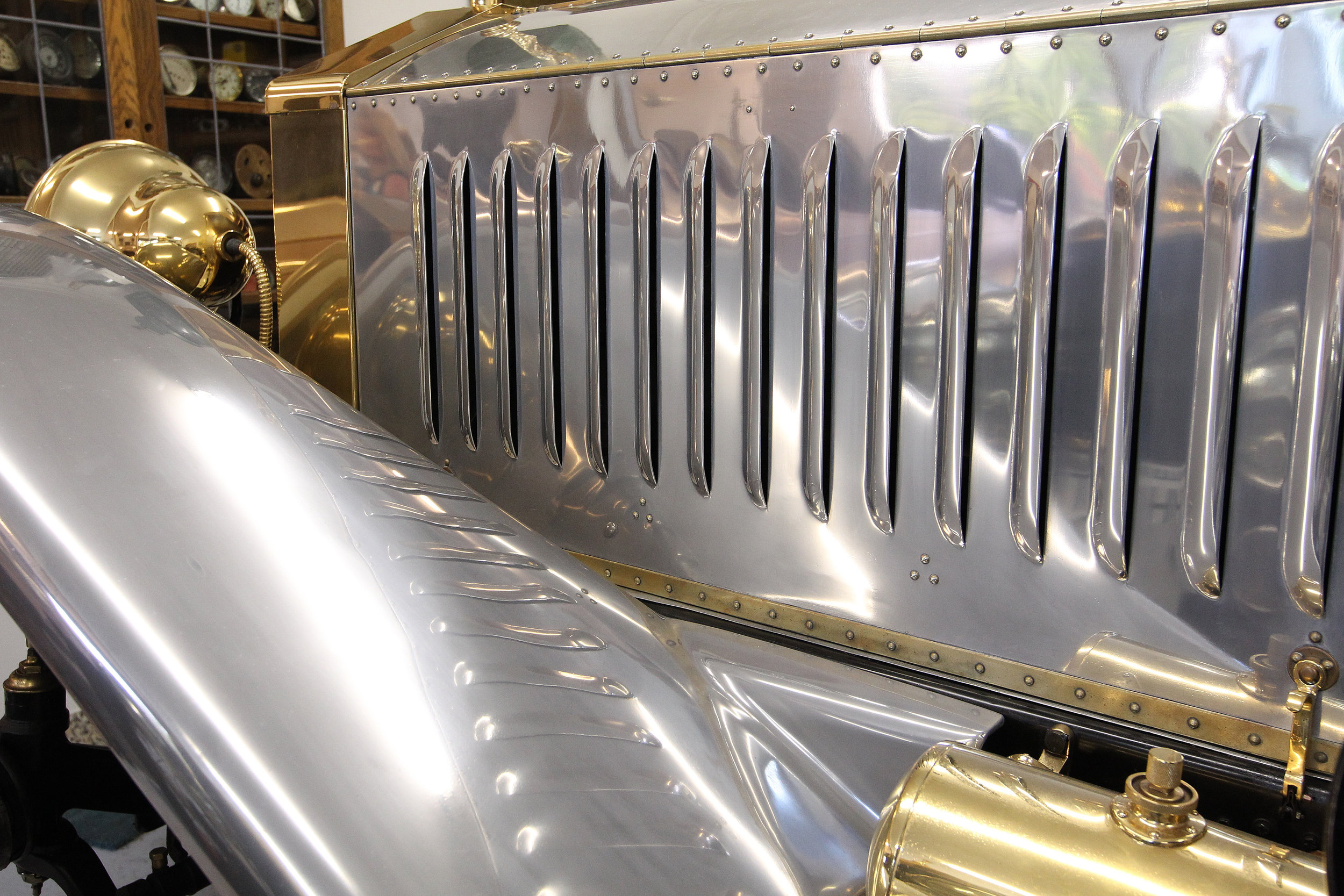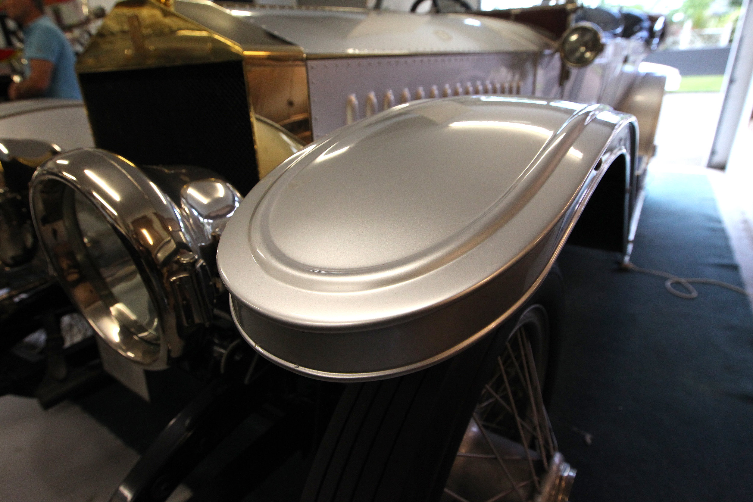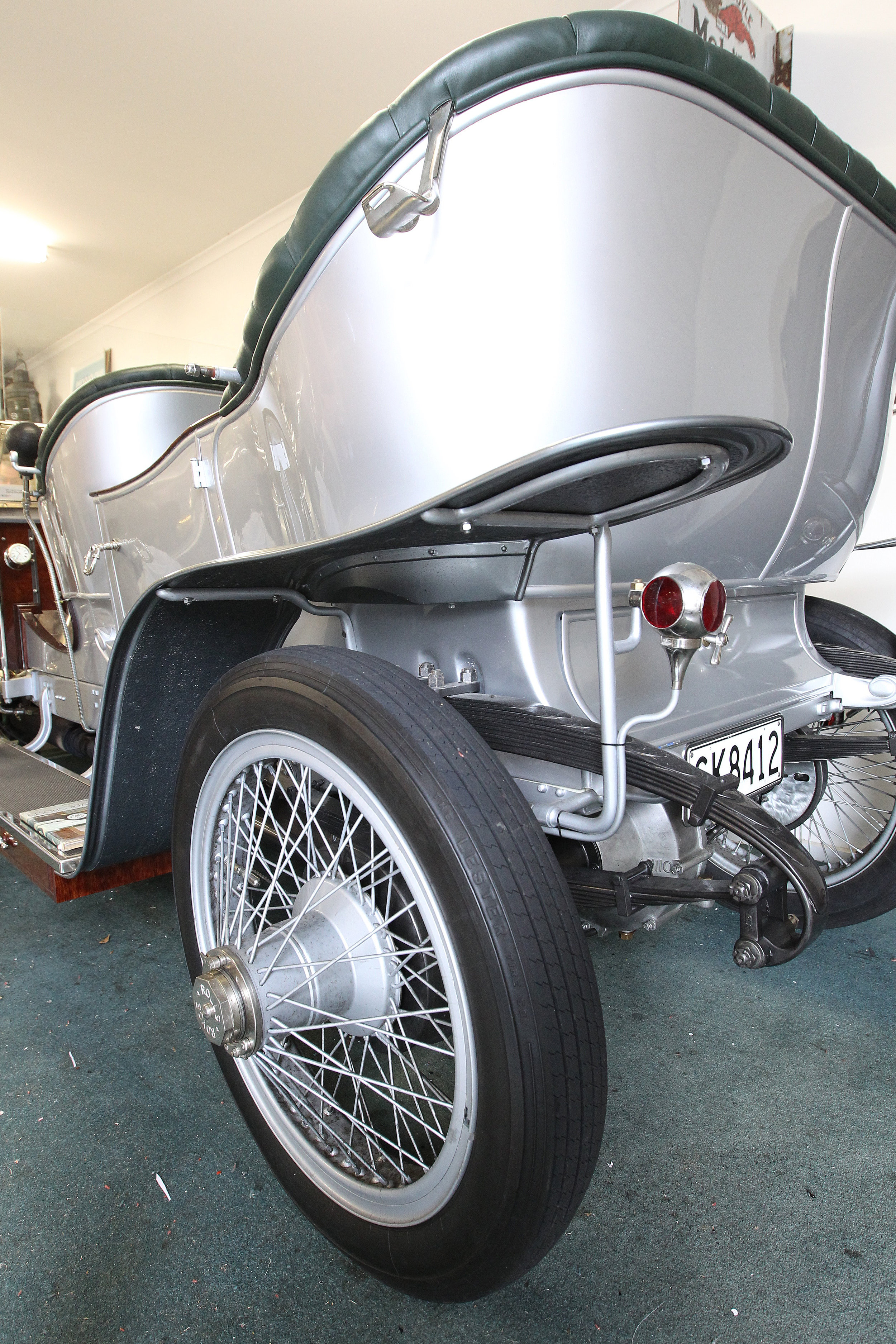 The bodies of the cars were built and restored by master body-builder Steve Roberts of Whanganui. The bodies are aluminium with steel mudguards. The two earlier models are painted silver but the whole 1920s car is clad in polished aluminium, including the guards. It looks very impressive. The 1914 car has an original body.The three cars all have an interesting history.