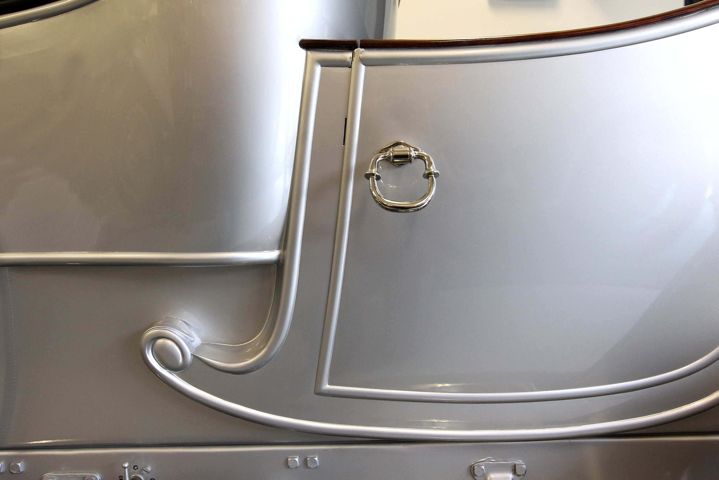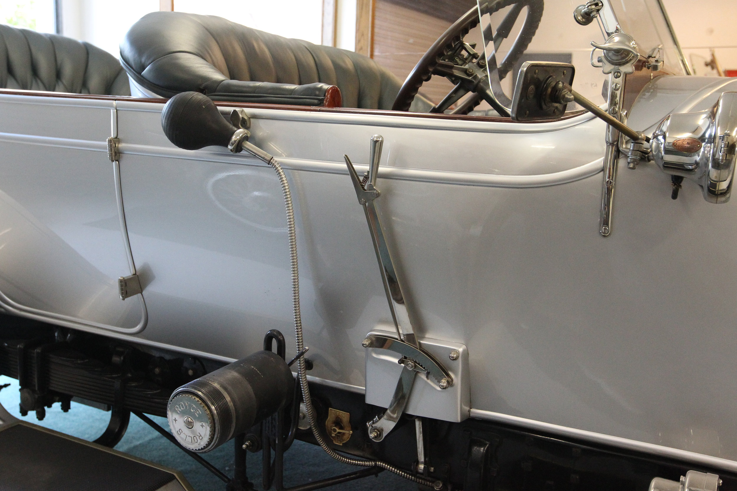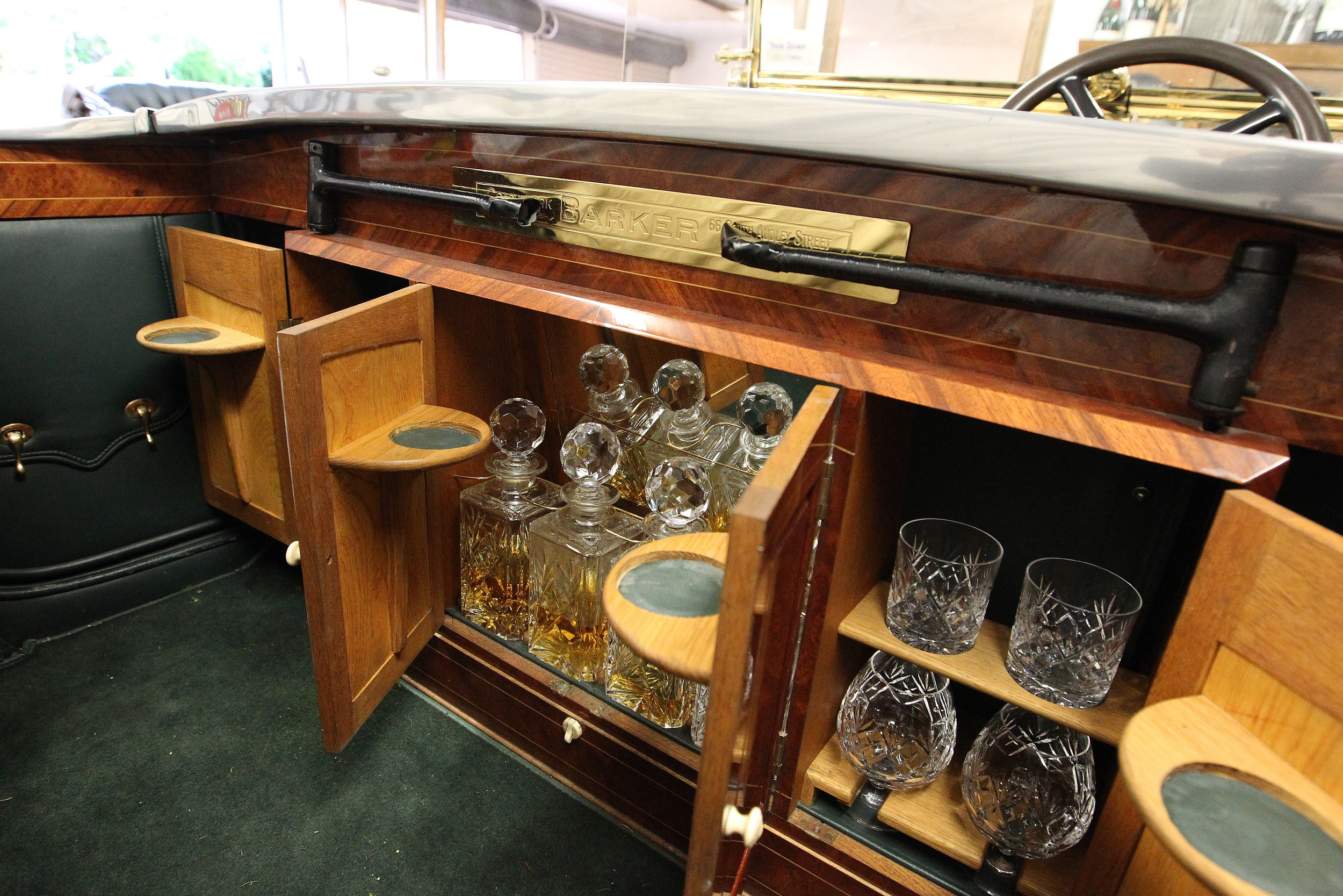 The 1920 model was built for a Major Murphy in the English army and it cost 2000 pounds when it was made. And that’s without the body. In the back is a cocktail cabinet made of elm burrwood. The car has three horns—a rubber bulb horn and two electric klaxons.