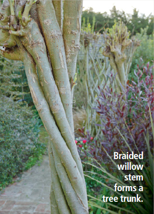 Throughout the garden, willow wands twisted into shape and then planted strategically make living sculptures. Braided willow stems form the trunks of the trees. Mike points out that the pencil-thin wands have grown to wrist-thick trunks in four years. Imagine what they’ll look like in 20 years time?
