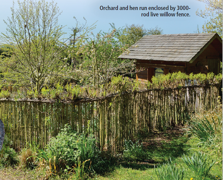 At the front gate, a wall of woven, live willow edges its way around Annemarie’s herb garden. The orchard, which serves as a spacious hen run, is enclosed in a giant willow basket. He planted and wove the 3000 live willow rods over two solid weeks one winter. He weaves the outdoor structures in the winter months when the plant is dormant.