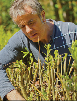 At the top of a knoll just a stroll from the kitchen door stands an extraordinary potager: four knee-high baskets—each measuring three metres wide—are made of woven live willow. He makes the borders of the raised beds from basketry because they look beautiful and follow a tradition that goes back to medieval times.