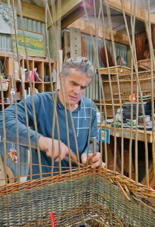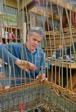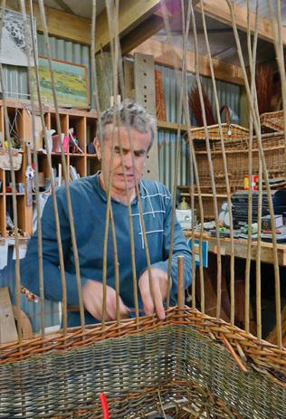 He continues the weave until the tips are reached then trims off protruding bits with secateurs. To tighten the weaving, he taps the willow down with a rapping iron. When the wale is fi finished, Mike uses a ruler to check for uniform height all around. Then he puts down uprights in a “4 behind 2” border. Mike Lilian explains that a wale is the name given to a type of stroke in willow weaving that involves working three or more rods at the same time and in a defi ned sequence.
