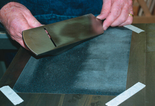 You could glue the wet and dry sandpaper to the surface but I usually either just let it sit there or use masking tape to hold it down. If you wish, before you start, you can use a marker pen to place a wiggly line on the base of the plane which shows clearly how the sole is responding to the sanding. The sanded portion of the sole will obviously be shinier than the rest so even without the marker pen you can generally understand how the flattening process is going. If you find the process is only sanding at the edges or at each end, then you may need to go to a coarser wet and dry sandpaper and gradually work your way up to perhaps about 600 grade.