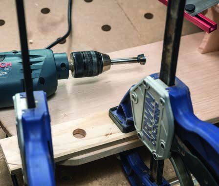 To create the jig, I drilled straight into a 4 x 2 (47 mm x 40 mm) block of timber. Next, on the tablesaw with the blade tilted over, the top and bottom of the block were ripped away so the hole was then at the required angle.