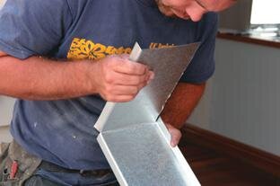 To make the sill tray around the door frame, metal is first formed around the bottom corner then cut to fit, nailed along the bottom of the sill, and flashed up the outside of the door jamb to a minimum of 150 mm.