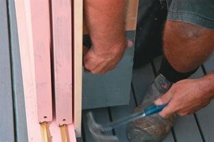When nailing or screwing timber, ensure solid packers are in behind the nails or the screws. We pin-gun the door frame temporarily to hold it in place before we hard-nail it by hand. We put screws into the sill to help to hold it up. A foam filler rod must be pushed in around the door and the cavity filled with expanding foam. Inside, the architrave is cut to fit and nailed as well as glued at the corners.