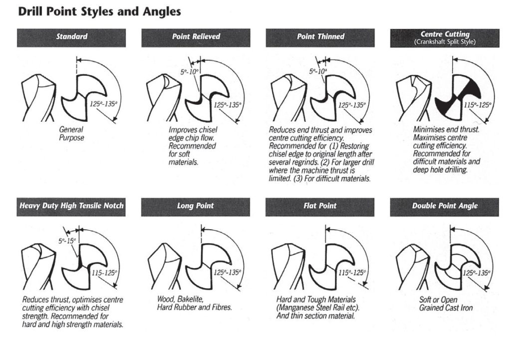 The most common in New Zealand has a general-purpose point sharpened to 118˚ and has a shiny silver finish or a blue/black surface finish. The silver finish is recommended for general purpose drilling of ferrous and non-ferrous materials. But it is particularly suited to materials such as aluminium, brass, and non-abrasive die-cast materials because the shiny smooth surface resists the build-up of material on the drill.