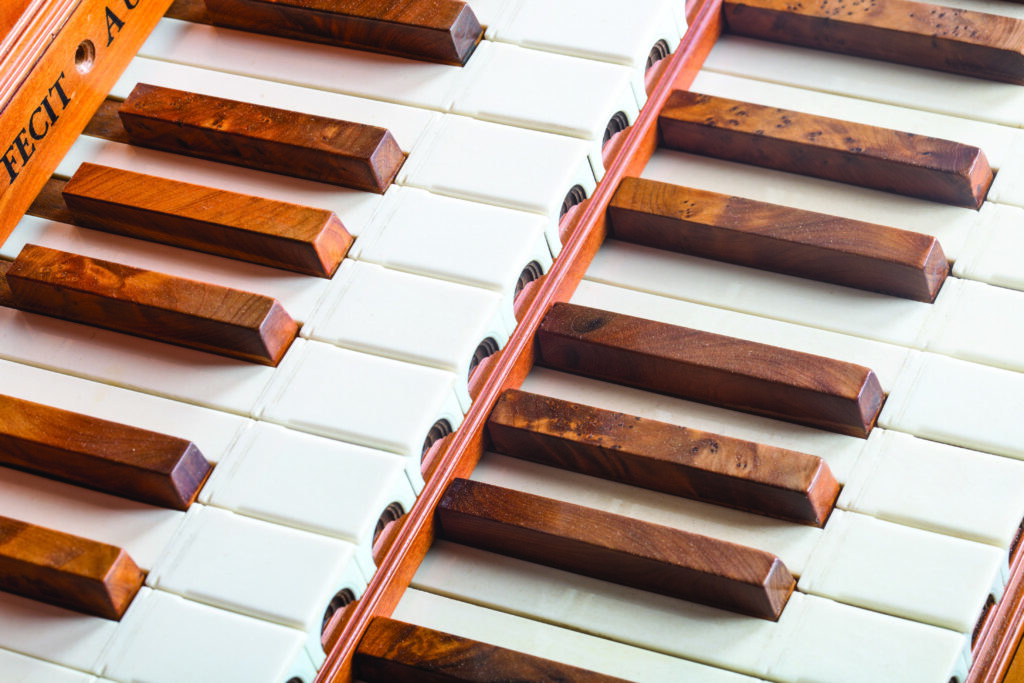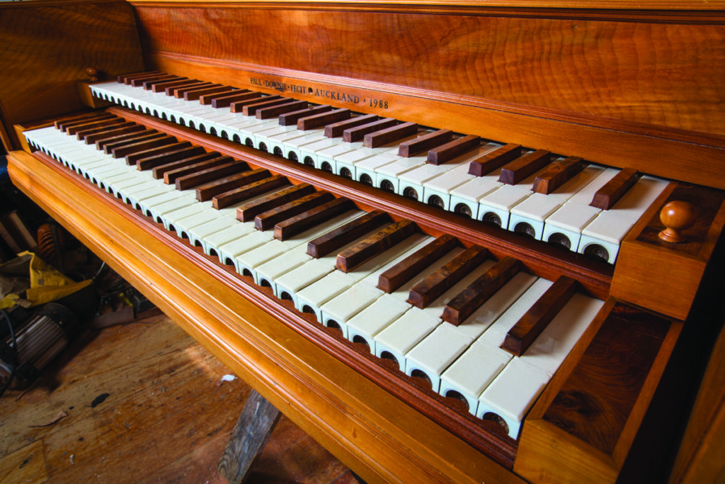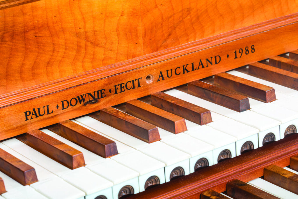 “The case is kauri, the white keys are bone, and the brown keys are thuja, which is highly decorative and smells so good when you cut it. It’s a copy of a famous German instrument in Hamburg.”