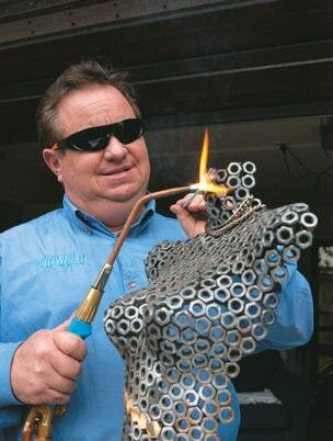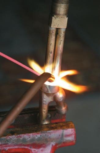 Fluxes are available, but flux is not necessary for brazing copper as long as the material is clean. When we brazed the copper pipes for this article, they were brazed straight off the shelf. Some brasses are OK but beware of the oxides.