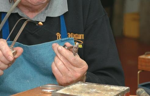 The alloy solder used in the case of the “royal” metals gold, silver or platinum, is of the same carat value as the host metal. These solder alloys have been designed to melt at a lower temperature than the host metal. In the case of copper and bronze, jeweller’s use silver solder alloys. Sterling silver 96 percent pure melts at 960º C, hard silver solder melts at between 770 – 780º C, medium silver solder melts at between 740º – 760º C, easy silver solder melts at between 680º – 690º C.