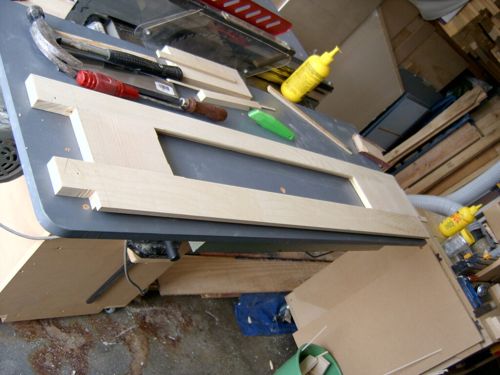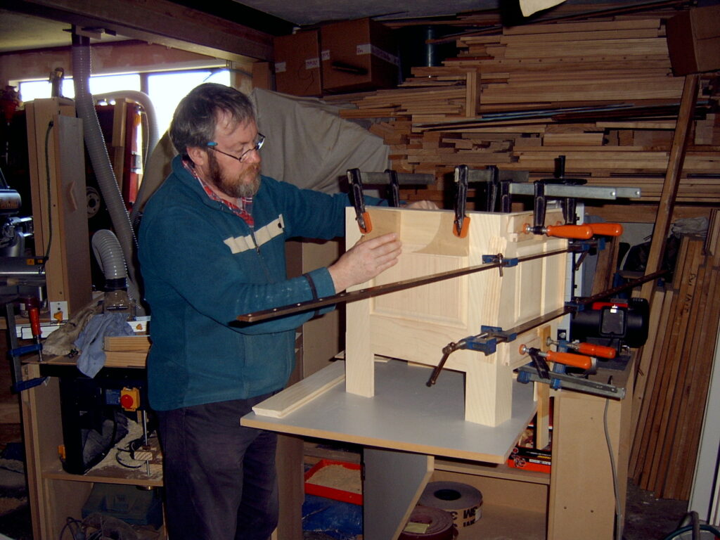 The doors are made like the other panel joints and as there is glass and not an infill panel there is no difference technically. I took care in assembling the hood door as the parts aren’t strong. The bottom rail has a very small cross-section and I decide to not router out the rebate for the glass but to leave it as a U-shaped groove to more strength to the joint.