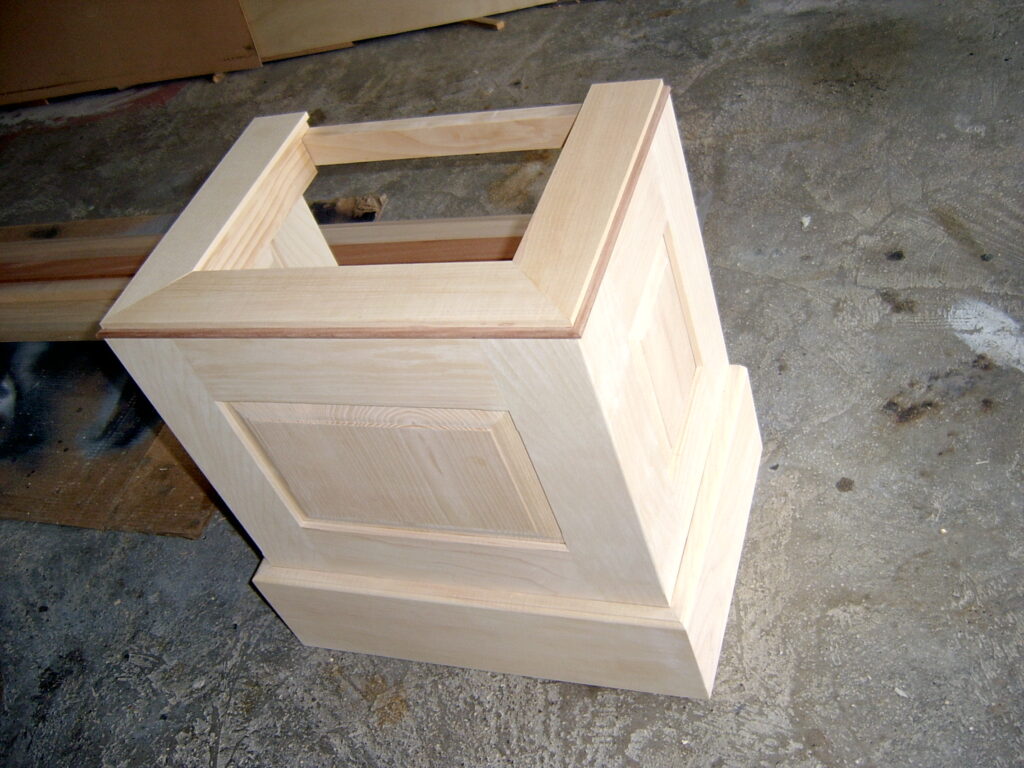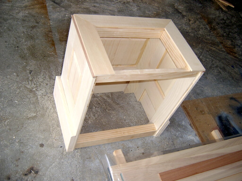 This also helps eliminate chip or burn from the cutter. The machined relief of the panel edges is sanded before assembly as it is difficult to do when assembled. The glued-up and assembled base I left overnight to fully cure.