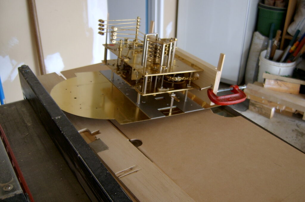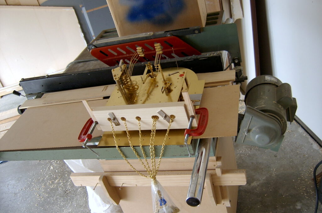Check that the weights will pass all the timber on the way down and that the pendulum does not strike the sides of the case. With the dial mounted to the mechanism, I checked that it sat where it was planed to sit and then checked that the chime mounting block mounts, to the backboard and the rods, hung in the correct place for the hammers.