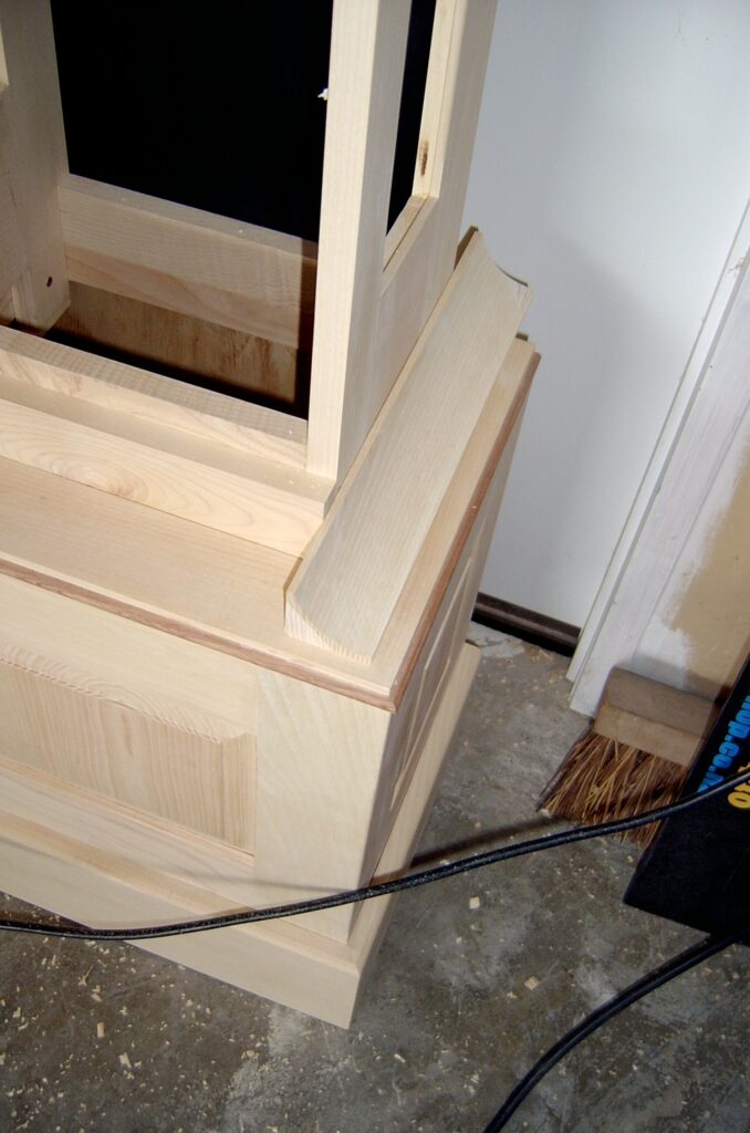 The bottom edge of the front panel has an ogee shape routered into the lower edge and around the corners where another moulding of the same shape will continue the shape around the clock sides. The two side mouldings have a round over upper edge as they are only a small bar and not as tall as the front panel, which will carry the final topmost moulding. They carry the moulding line along the sides to balance the moulding band around the clock.