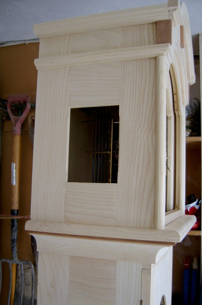 Next, the backboard is cut and fitted; this is for the chime rods to be mounted on and is used as a sounding board. Here I used screws and glue to fix it in place after making sure that it aligned correctly and was plumb. The trunk is screwed in plumb to the base and left to fully cure overnight. This needs to be watched, as out of plumb, the weights can catch on the internals of the case on the way down.