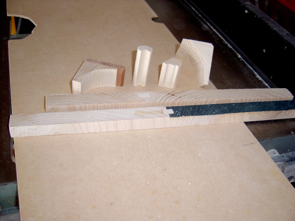 I set up a straight edge diagonally across the table saw to give me the correct height and length cut. Here, I prefer the trial and error method. Varying the angle across the saw bench changes the width of the coving. This is not the first time I have used this method to make a strip of coving, but extreme caution must be used. I do this with the riving knife and guard removed so it is imperative that utmost care be taken in this operation. When doing the cutting, feed through slowly and steadily, as any hesitation will leave a lot of sanding to be done. I hand-sanded these mouldings with sandpaper around a small tube on it. The result was worth it.