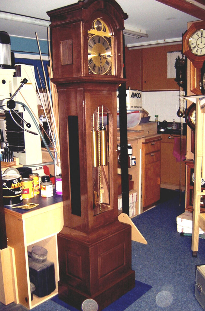 I have rubbed in a black bean stain to fill and highlight the grain, then I mixed stain with clear coat, cut the mix to use it as a sealer coat and sprayed the entire case. This gives colour between the grain which, being hardwood, has not taken a colour from the stain. Don’t forget to stain the glass beading when you are doing the clock case. Then it is two coats of clear Danish Oil to finish. All that remains is for the glass to be fitted and the clock to be delivered and installed. When installing this style of clock it is important that the clock is vertical, as any variation will cause the pendulum to swing further on one side of centre than the other. This can result in hitting the glass sides.