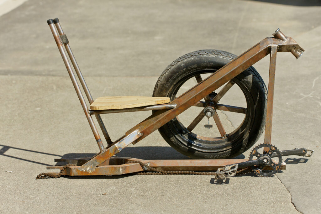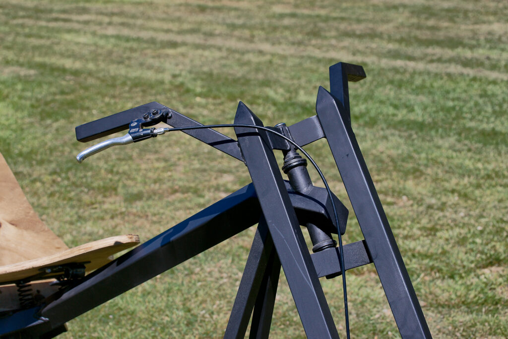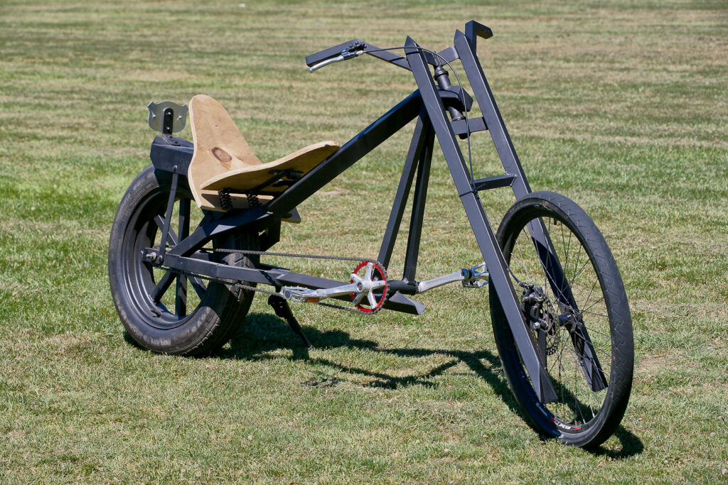 Vigilante is built from square tubing and has been inspired by the stealth bomber, hence the matte-black paint and angular surfaces. Vigilante is “a real dream to ride” and rides smoothly on the road due to its rounded-profile, space-saver car tyre.