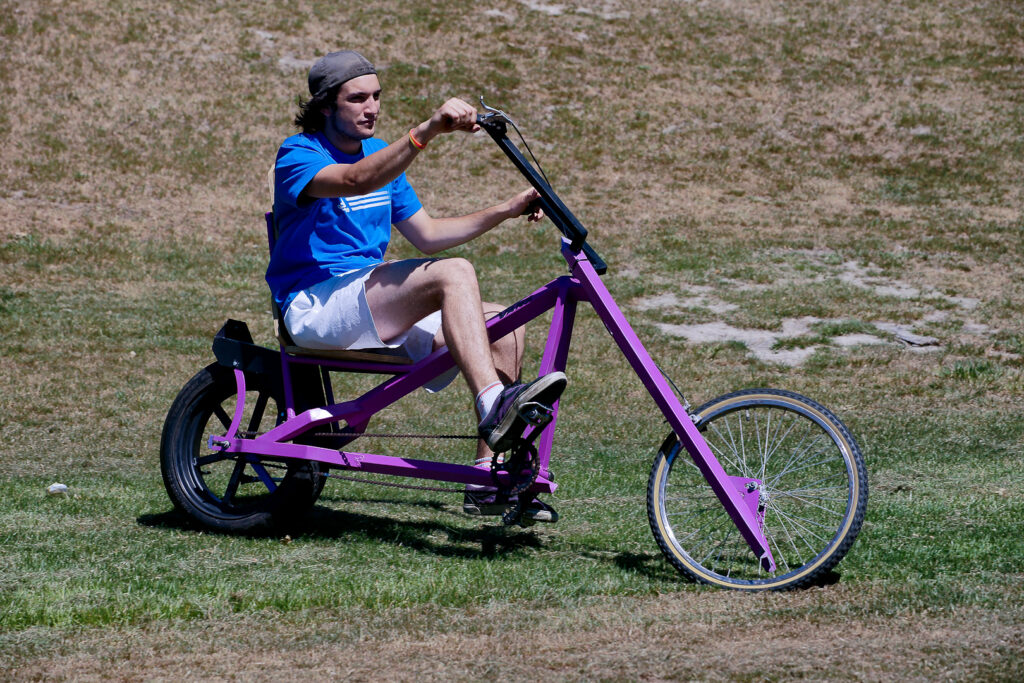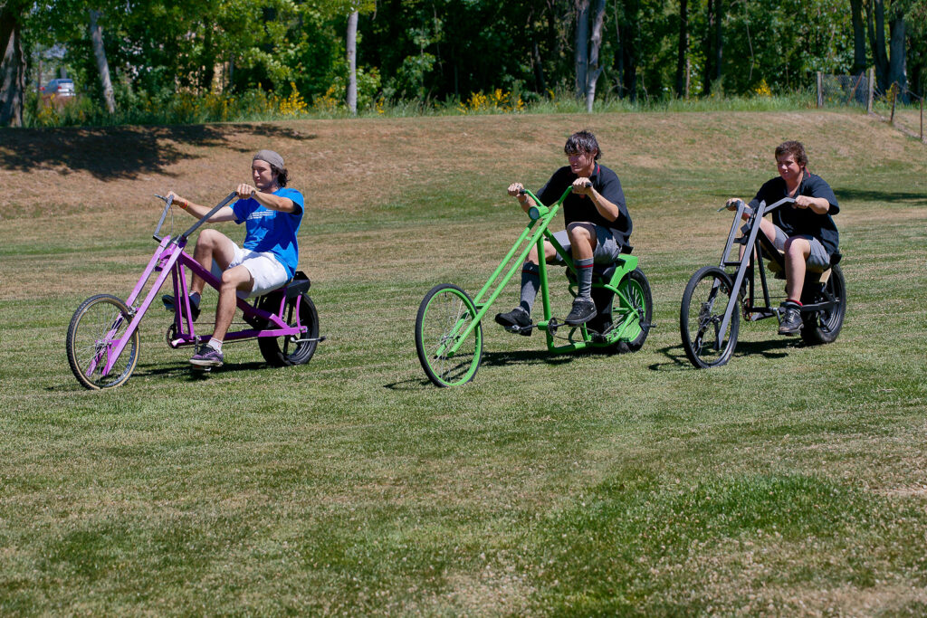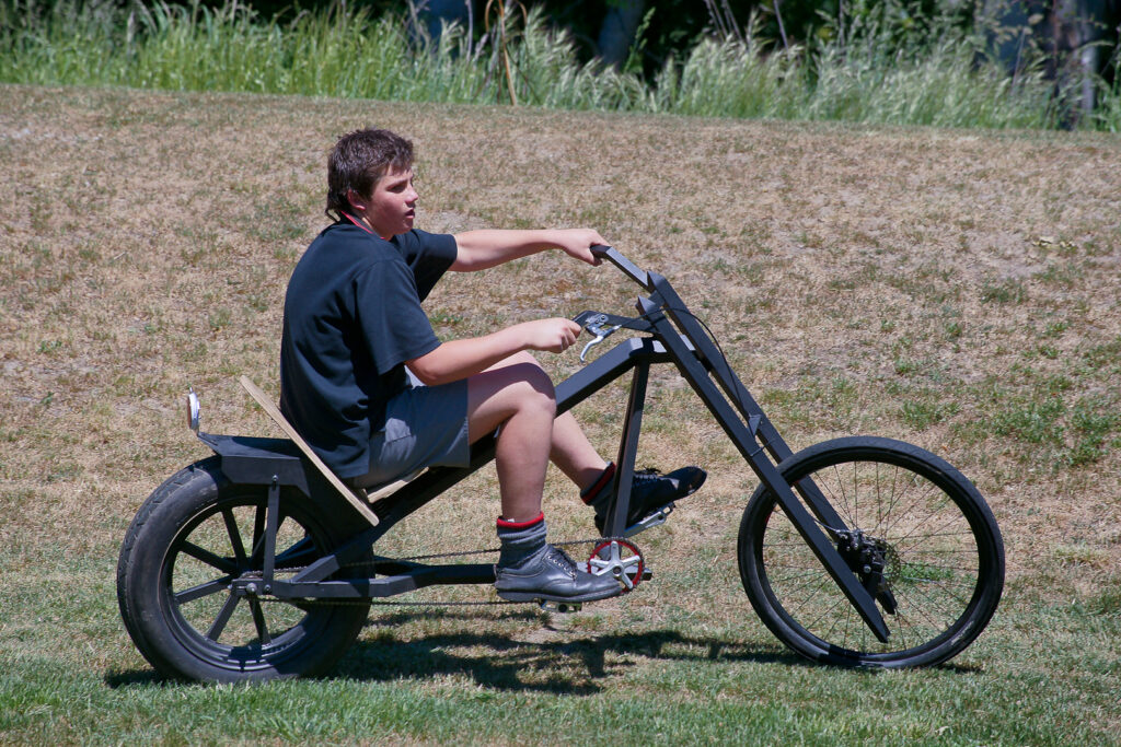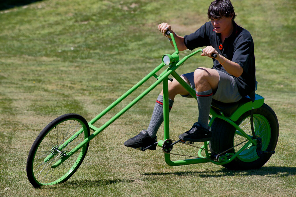 Overkill is painted green, has five-foot (1500 mm) long forks and uses a car tyre for its back wheel. The original builder used a 15” (450 mm) tyre, but Alan Minnear was given an 8” (240 mm) tyre that he says is plenty wide enough. He says Overkill takes a bit of work to control, but gets lots of looks on the road. He built Overkill first and was keen to ride it for fun, so bought himself a skull and crossbones helmet and pedalled around town, getting plenty of attention and thumbs up from motorists. That’s when he realised that pedal choppers would make a great project for students.