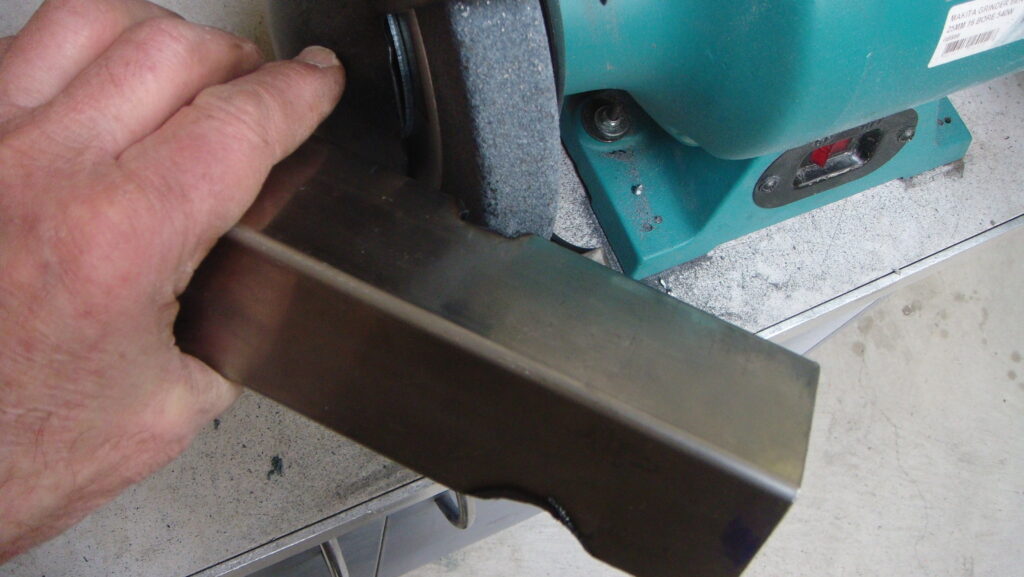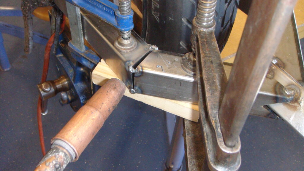 A piece of 40 mm x 5 mm flat steel is slotted to suit the 10 mm rear axle, bent to 45º and then welded to the lower rear frame. This is cleaned up before proceeding.