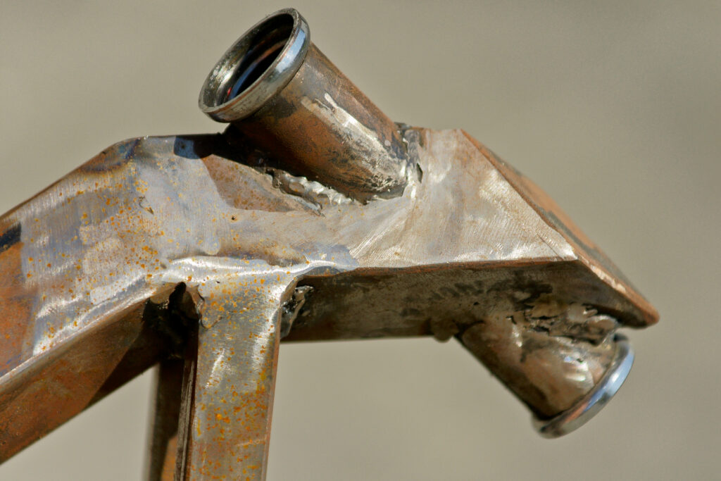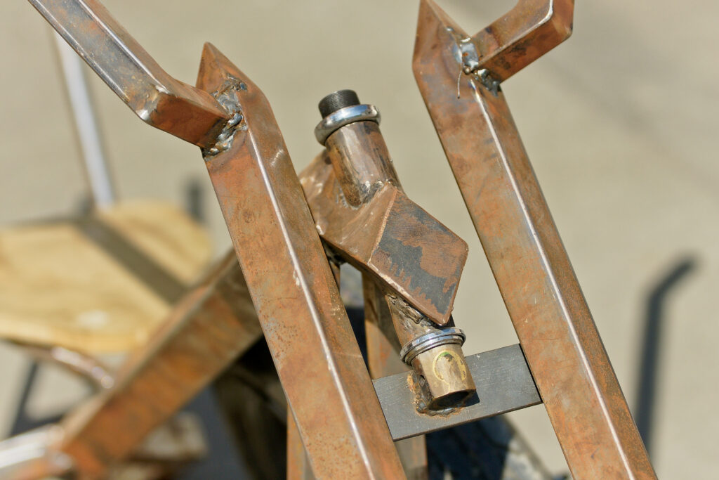 The front forks for the Vigilante use 1 ¼” (32 mm) tubing on the diagonal. The length of the forks can vary, but the look should be more conservative than that on Overkill. We made the pyramids at the top by cutting out the corners and bending the resulting flaps in until they met at a point. We then MIG-welded the corners and cleaned them up with a disc flap sander.