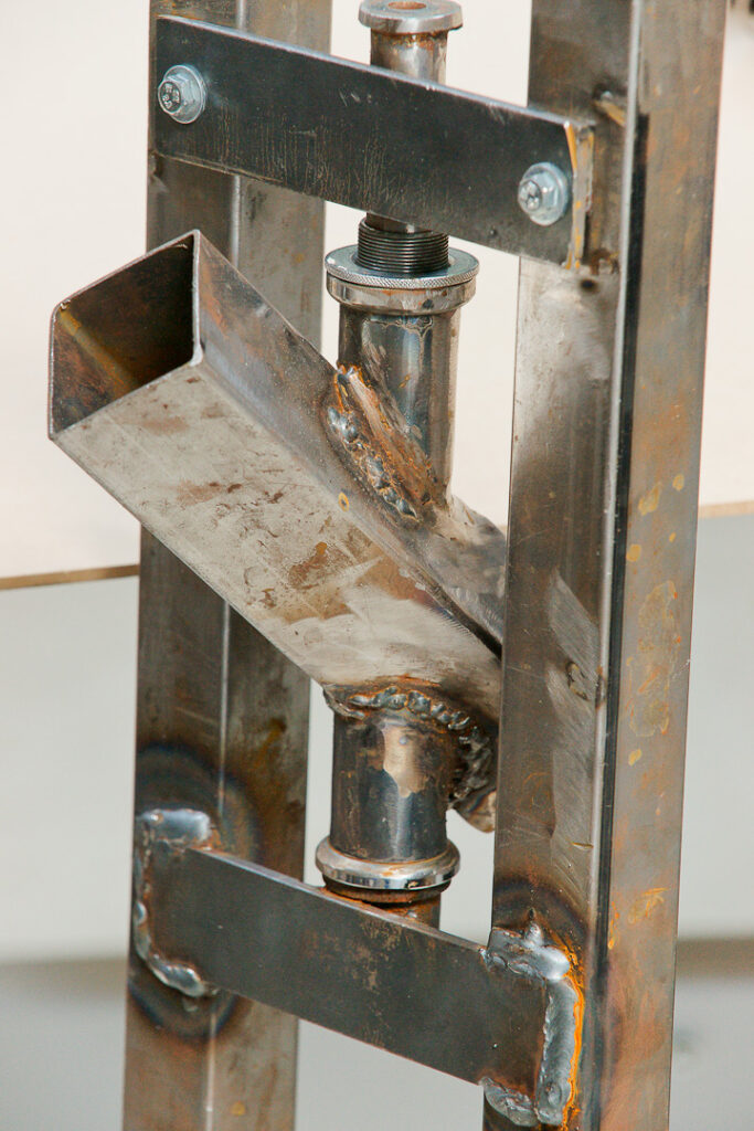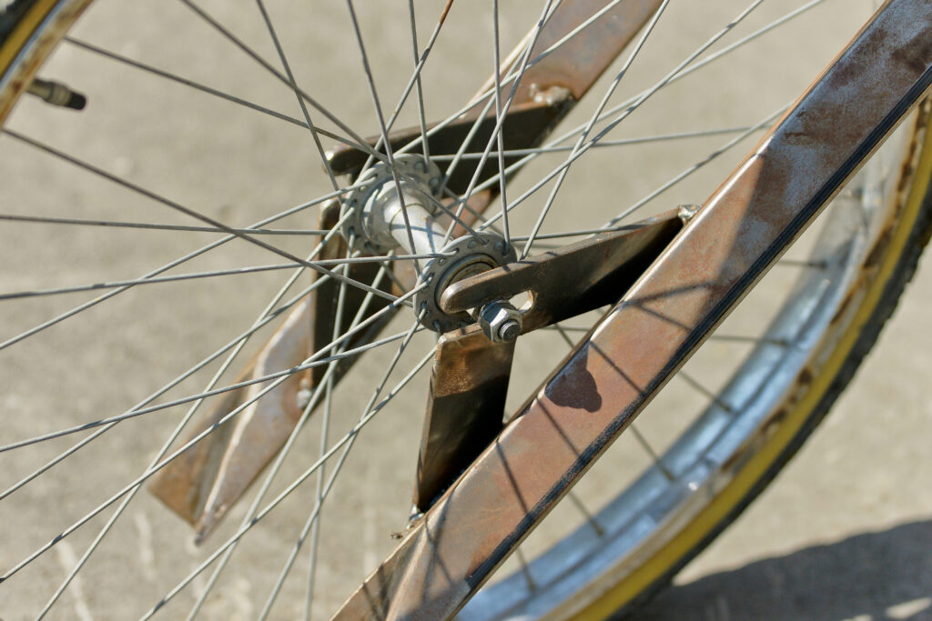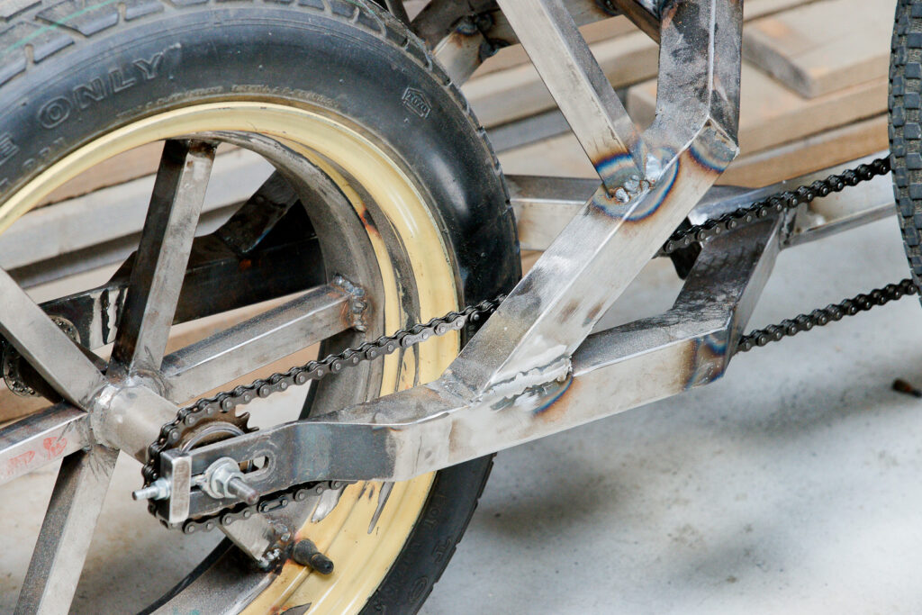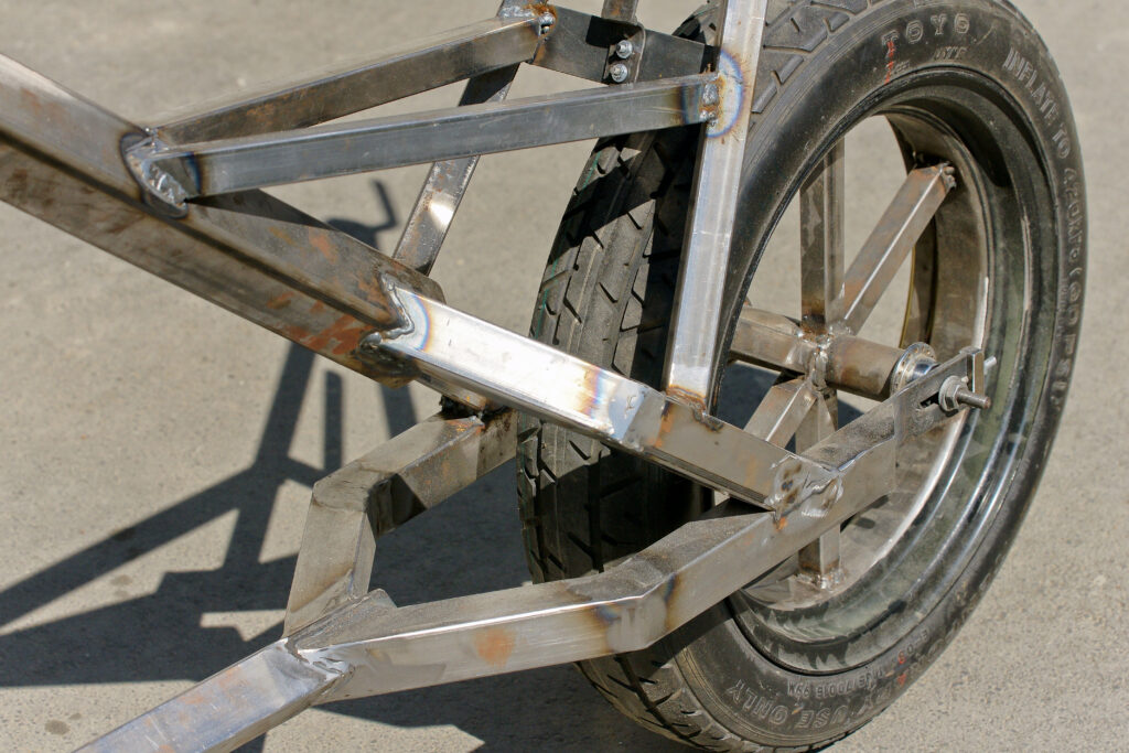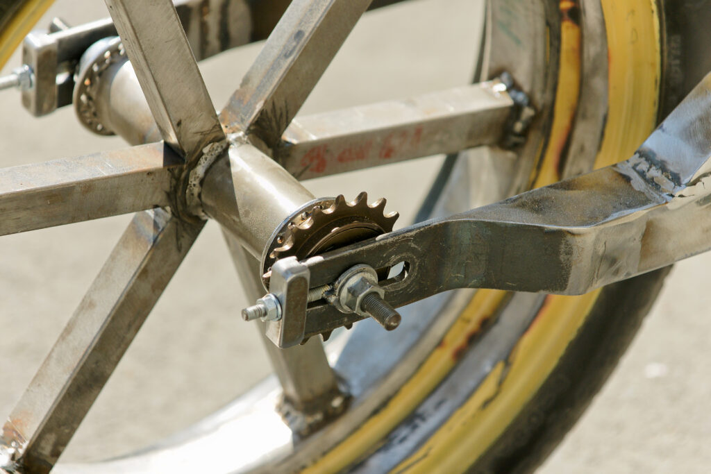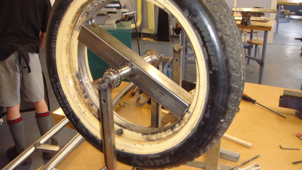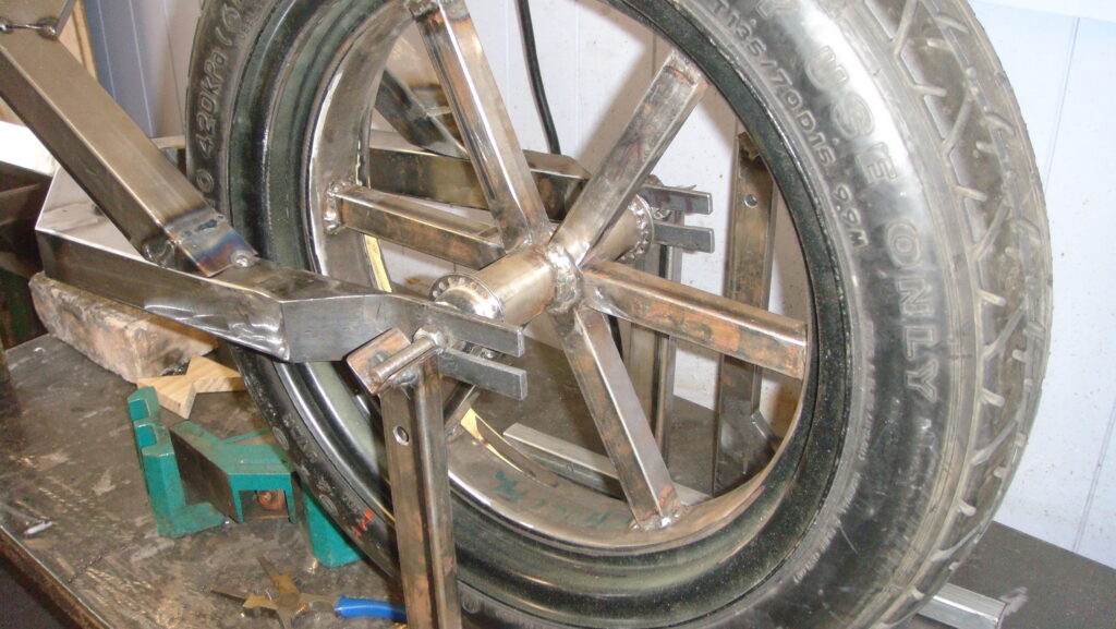 We made spokes using square steel tube from ¾” (19 mm) to 1” (25.4 mm) in size, first fitting a master spoke and adding others until we reached the required number. Four, six, and eight spokes are common. A truing jig is helpful when aligning the rim and spokes. When the wheel is running true, the spokes are MIG-welded. Again, the tyre can remain in place.