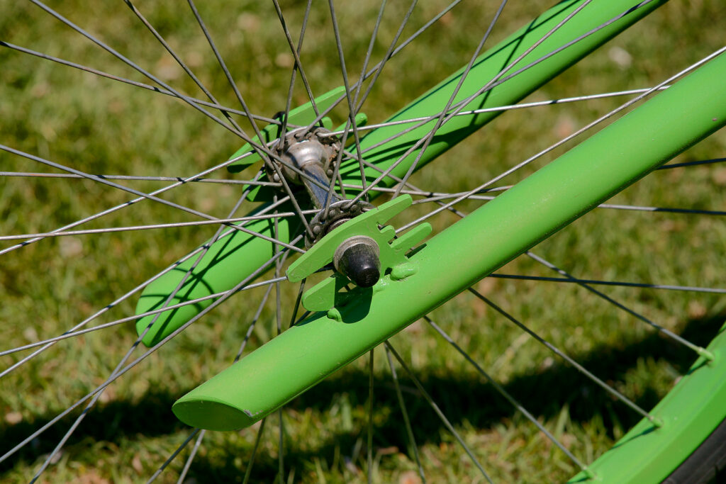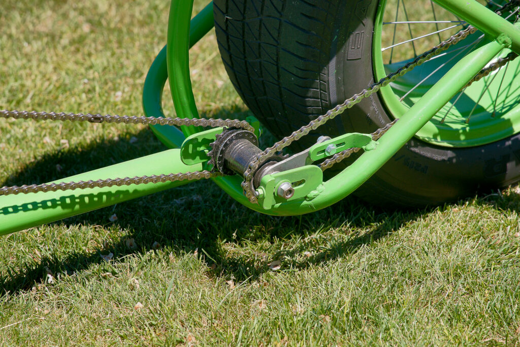 Overkill needed a BMX back-pedal brake as a lay shaft, fitted where the first chain ends. This is used so that the second chain is moved out to line up with the back wheel. It also serves as Overkill’s only brake. Note here that the lay shaft also needs chain adjusters for the front chain similar to those used on the rear wheel.