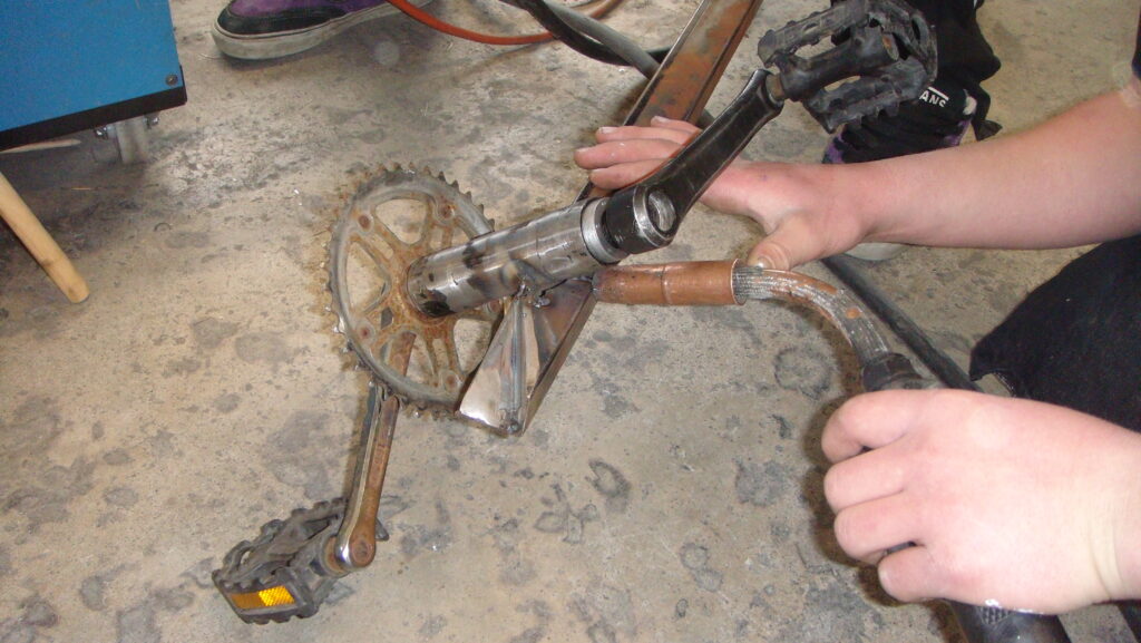 Vigilante needs a three-piece crank set, not a one-piece S-shaped unit as found in a BMX bike. We used crank units from older ten-speed bikes and bikes we used to ride as kids. The three pieces are the left-hand crank with pedal, the right-hand crank with pedal and chain sprocket, and the axle going through the frame to hold both cranks.
