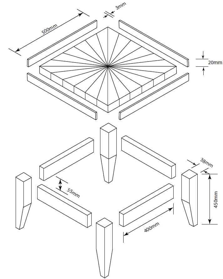 For this project, instead of choosing a basic option of joining a few narrow boards side-by-side to create a solid top, I chose to try a technique I haven’t used before – using wedges of timber to create a radial effect. For your top, you certainly do not have to go this far, and you can choose to have a solid top (these can even be purchased pre-made), or even a solid slab (with or without a natural edge)