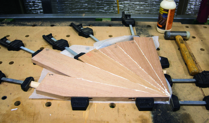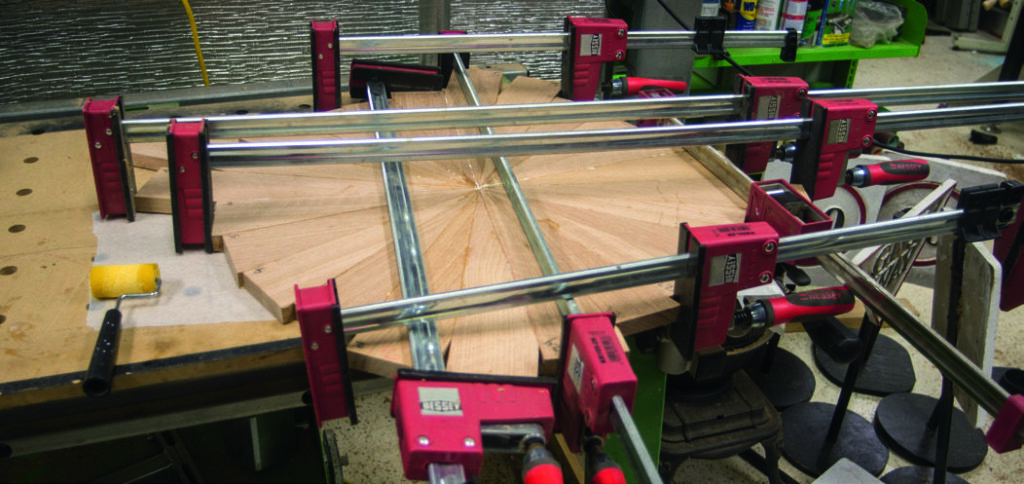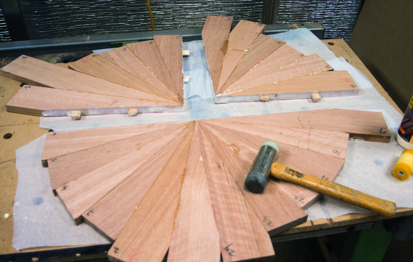 During the glueup, each wedge aligned accurately, and what is quite a complicated exercise became a lot easier. Rather than attempt to juggle all the segments at the same time, I chose to glue up a quarter of the top at a time, then once sufficiently dry, bring the four quarters together.