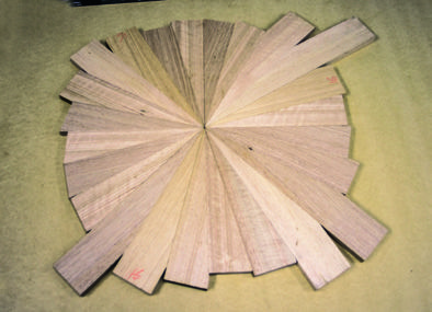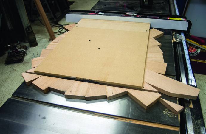 To determine the angle for each wedge, I marked a board up, drew a diagonal, and measured the angle. It was very close to 15 degrees, which is perfect, being an even fraction of 360 degrees. This determined that 24 wedges would be needed for the top.