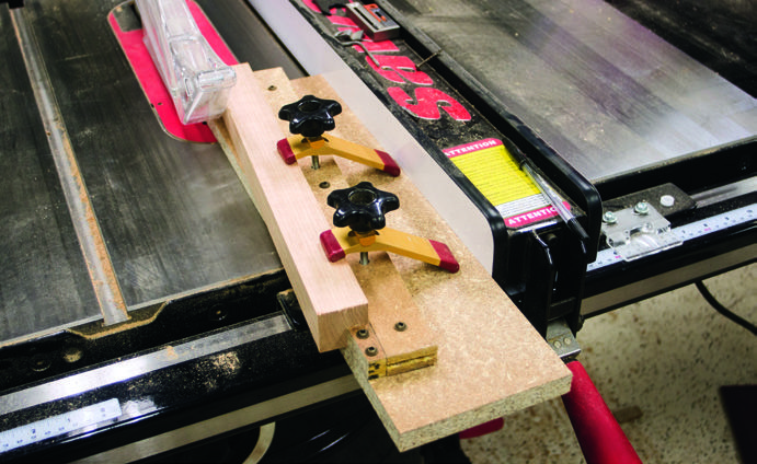 There are a few ways to accurately cut the angle for the wedge. One is to take a piece of board and screw a fence to it that is 15 degrees to the blade. This jig runs up against the fence and is also excellent for producing tapered legs. It is one of the easiest jigs to make, and use, and puts a lot of the commercial options to shame.