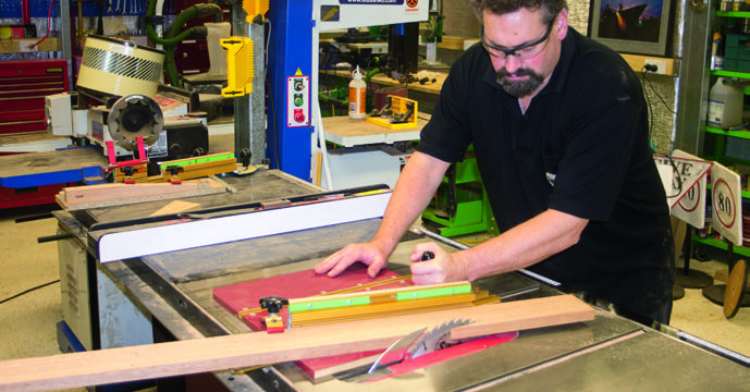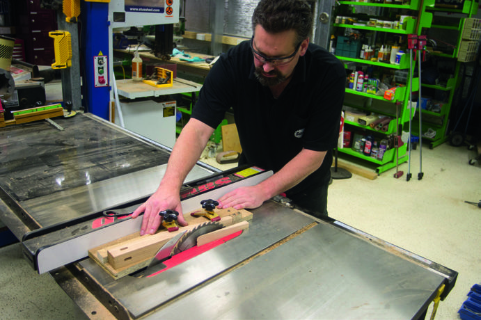 You must never try to cut a piece of timber freehand. You are pretty much guaranteed to twist the piece of timber relative to the blade. The blade will then grab that piece of timber and throw it at you. While doing so, it is very easy to have your hand dragged into the blade. Timber being cut on a table saw must be either supported against the stationary fence or held firmly against the mitre gauge (which then slides in the mitre track). Don’t ever be tempted to ignore, or break this rule.