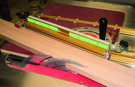 Cut the first edge, then rotate the top 90 degrees. Unscrew the supplementary board, and again reattach it on the new side. Run the top through the table saw again. Now, with the supplementary board removed, set the fence to the final dimensions of the top, and true up the final two sides. I then chose to add a contrasting strip around the outside, just to really set the top off. It was made from Queen Ebony from the Solomon Islands, and just a little amount really sets a project off.