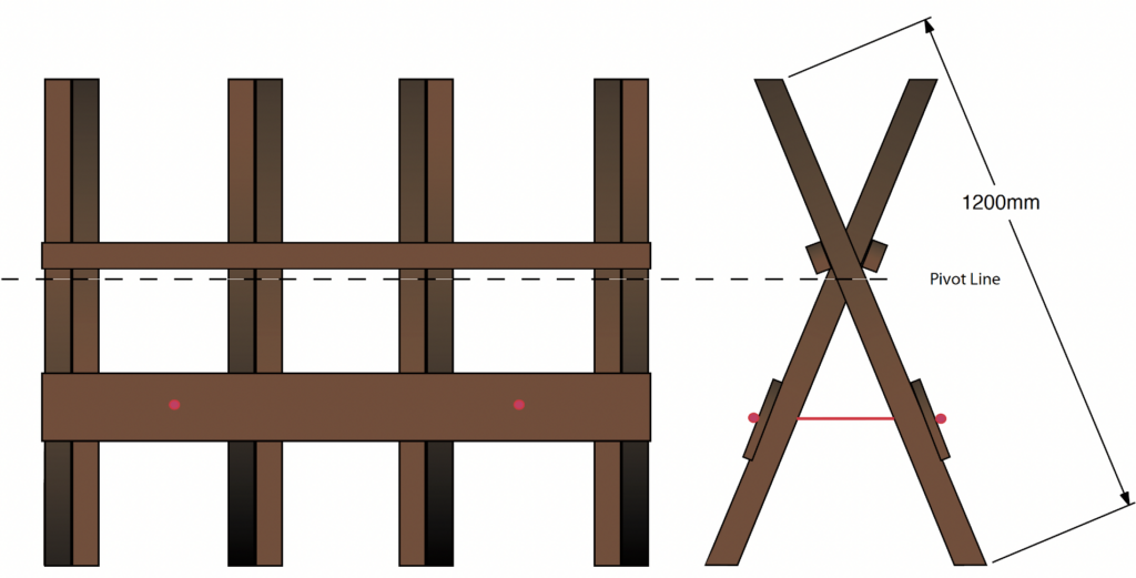 To make this sawhorse, cut two 4.8 metre lengths of rough-sawn tanalised 75 mm x 50 mm into eight 1200 mm pieces. They each need an angle of 60° cut on them. Each pair is made into an “X” that is pivoted 500mm from the top. Use a 100 mm nail to join them. Two pairs are assembled with the left piece towards the front and two with the right piece towards the front.