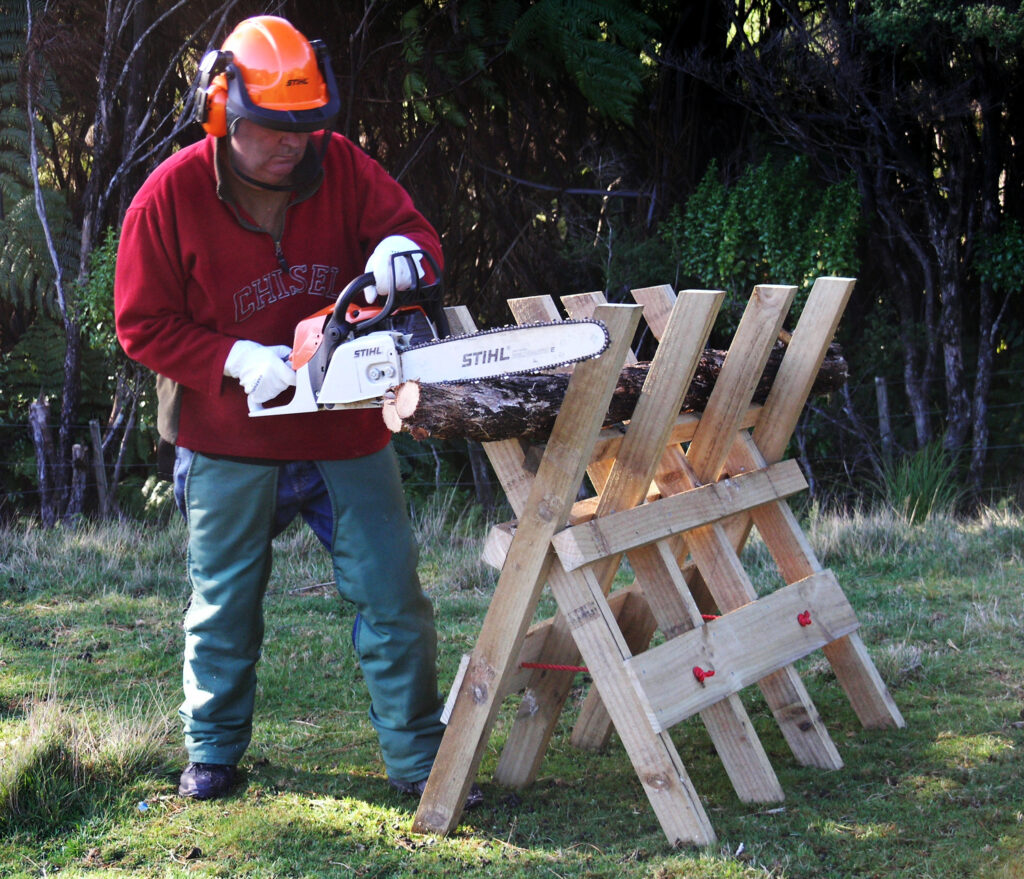 It is essentially four crosses of timber braced to form a cradle for cutting your firewood. You lay the length of wood to be sawn in the cradle and then chainsaw it between the crosses. A sacrificial fence batten stops the chainsaw from cutting the cradle to bits. This is periodically replaced. You can fill a wheelbarrow with firewood in no time.