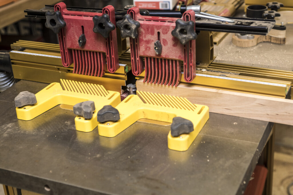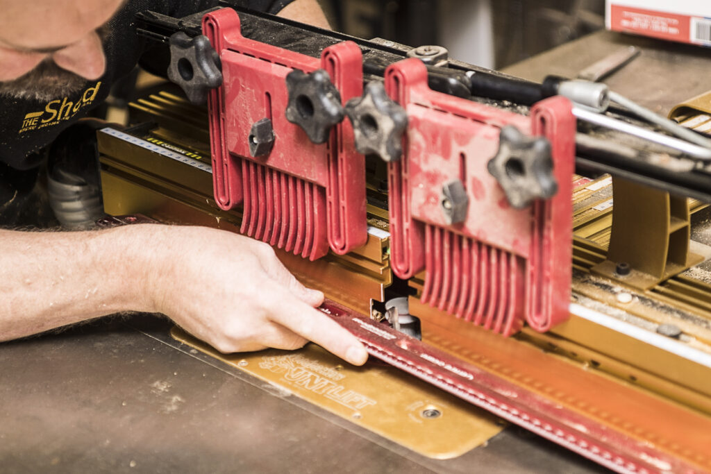 With the router bit mounted in the router table, I used a straight edge to ensure it is collinear with the fence. I then used featherboards to hold down the timber on the table and against the fence. This minimises the change of variations in pressure which cause an uneven cut and keeps your fingers well away from the cutting surface. It also makes the operation faster, as board after board can be fed quickly through the machine at the optimum feed rate for the cutter and without pauses from one board to the next, especially near the ends of each cut.