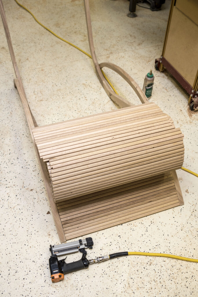 I coated further up the rails with more of the glue and rolled out the tambour further. I repeated process until the whole lounge frame was covered.