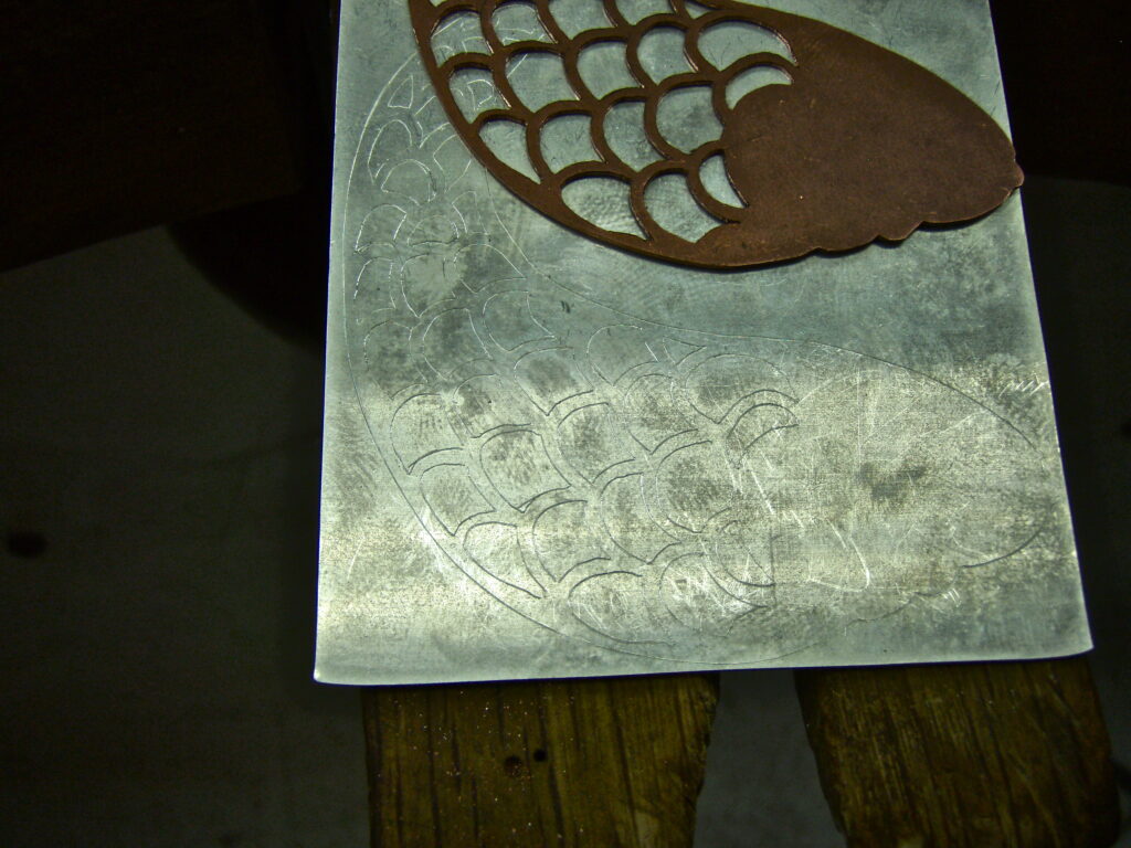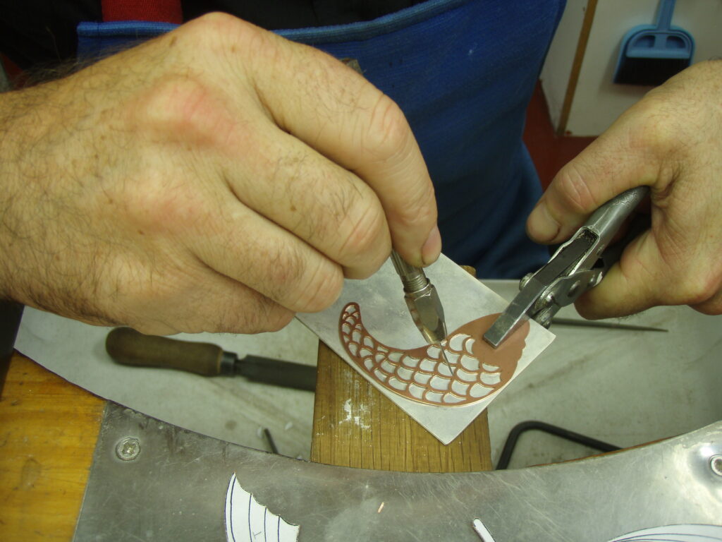 Firstly I took a photocopy of my artwork and stuck it to a sheet of 0.5 mm copper plate with double-sided tape. This is to create templates of the body and fins. The templates are cut out of the copper using a piercing saw.