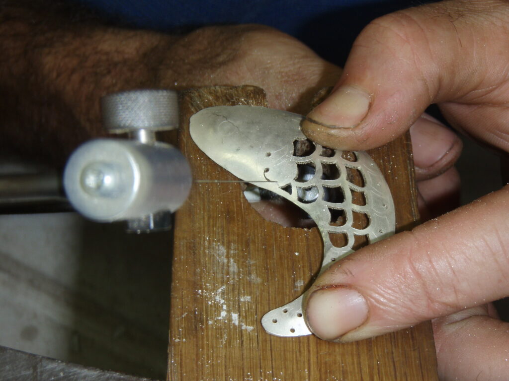 The parts of the fish were all sanded to a 1200 grit finish, then placed into a tumbler with polished steel shot and tumbled for four hours. This polishes the silver by burnishing the metal. This action also “work-hardens” the silver.