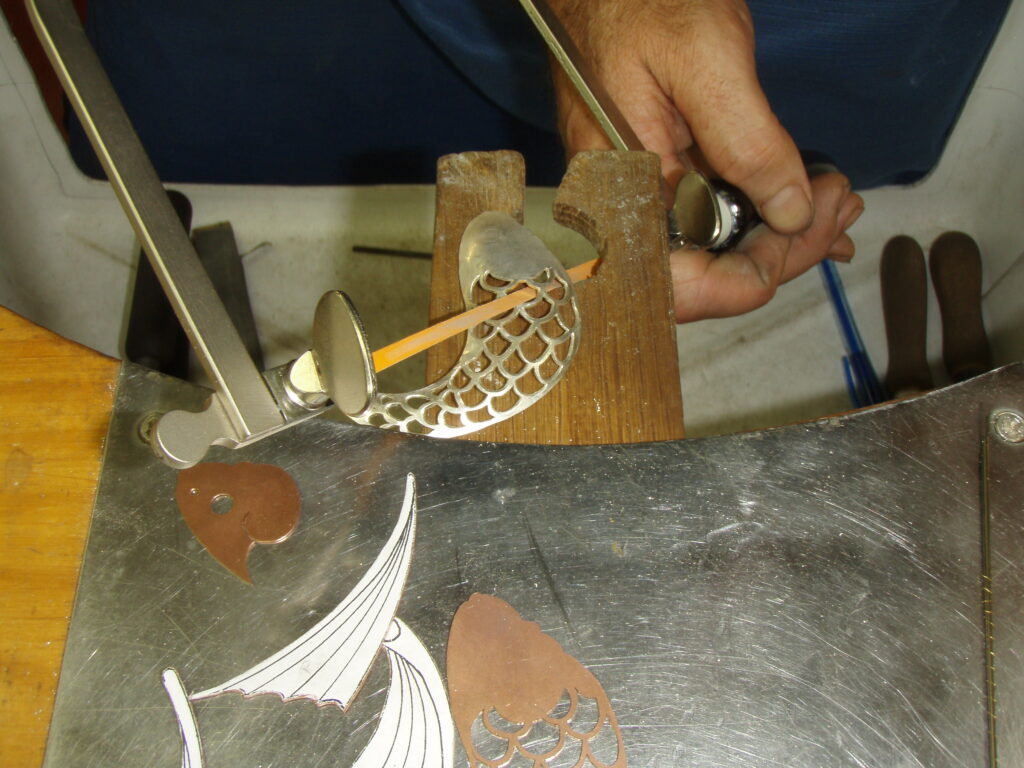 I then drilled holes into the top plate for each of the scales and cut out each scale with a jeweller’s piercing saw. I tidied up the scales with needle files and then a strip of sandpaper held in a saw frame. This process is repeated with three grades of sand paper 360 grit, then 800 grit and finally 1200 grit.