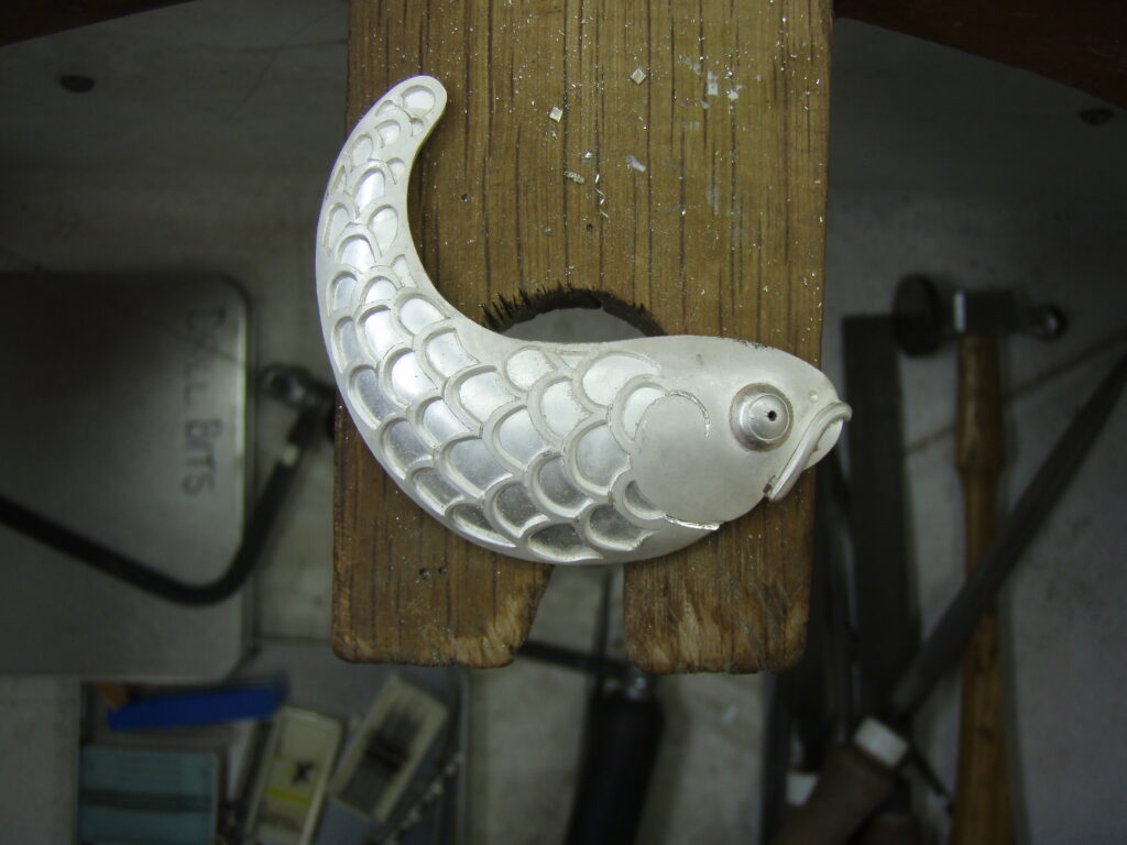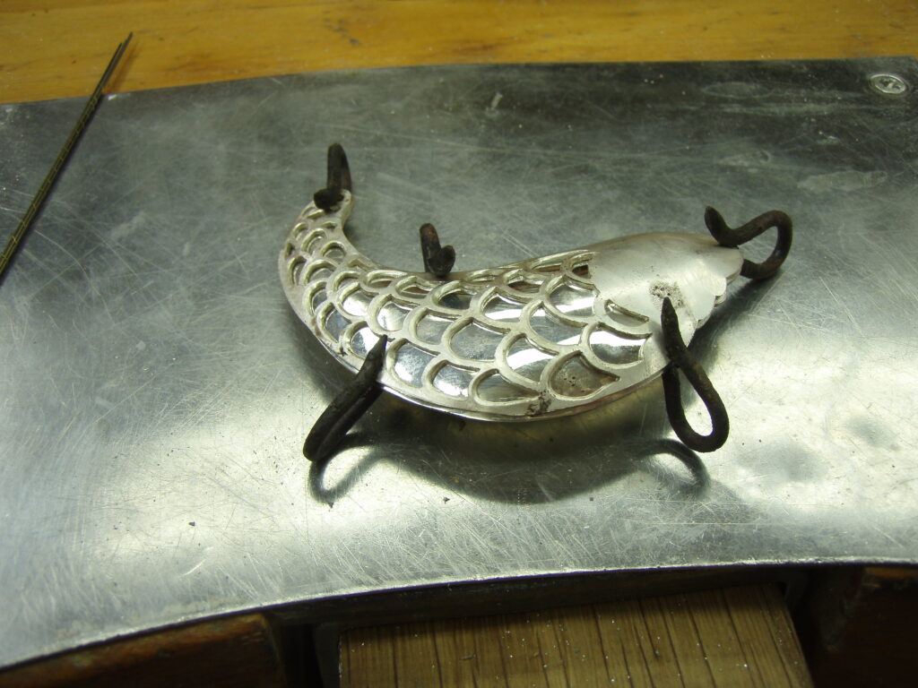 A loop is soldered on the back where the tail joins the body. This is the pivot point of the piece and is where the chain will hang when it is attached. Texture was added to the back of the fish head and the solid scales.