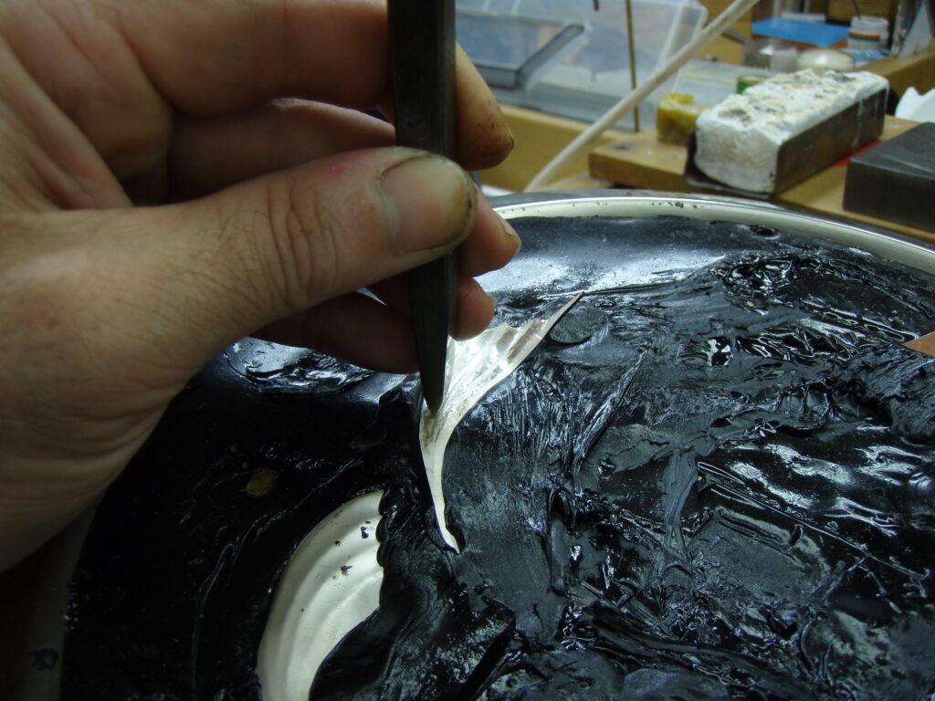 The fins are then removed from the pitch, annealed, turned over and placed back into the pitch bowl. I used a rounded punch and the space between the ribs was chased to give it a curved shape.